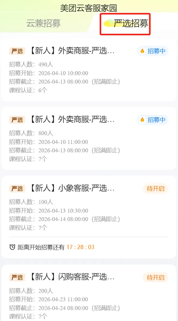 严选招募:外卖商服-严选在线(490人)、外卖商服-严选电话(800人)、小象客服-严选在线(100人)、闪购客服-严选在线(200人),一共招1590人,