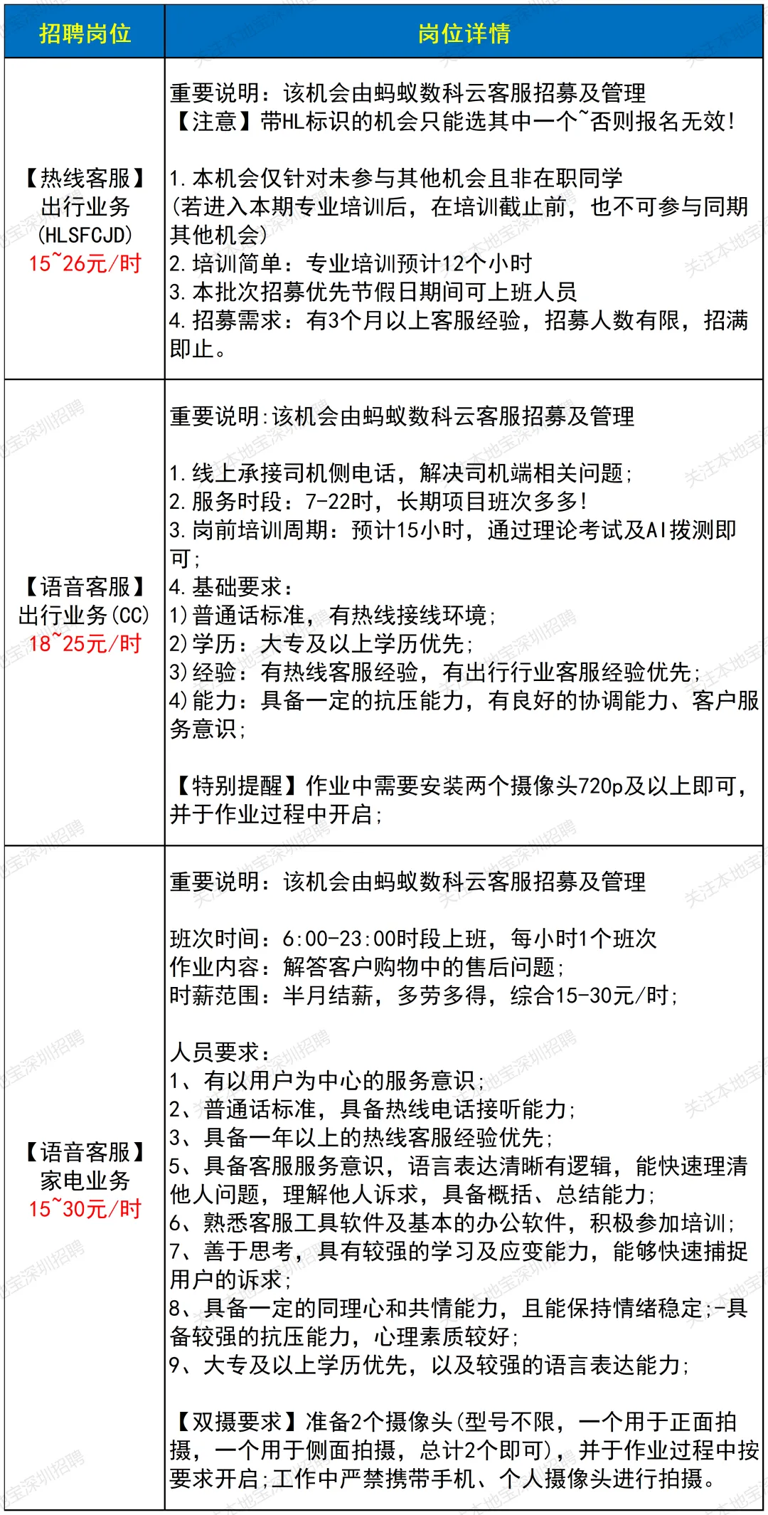 目前在招的有:出行行业-热线客服、语音客服,家电业务-语音客服,岗位要求及薪资如下图所示