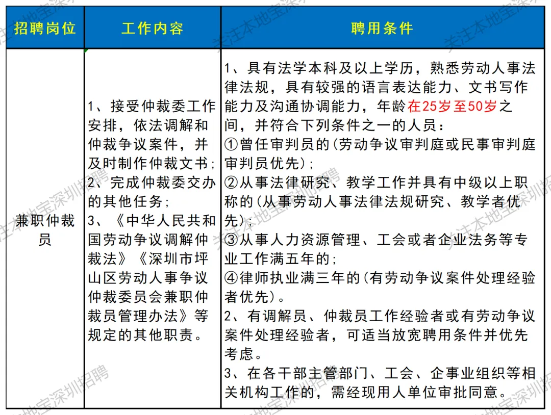 坪山区人力资源局拟面向全市公开招聘深圳市坪山区劳动人事争议仲裁委兼职仲裁员。具体要求如下图所示