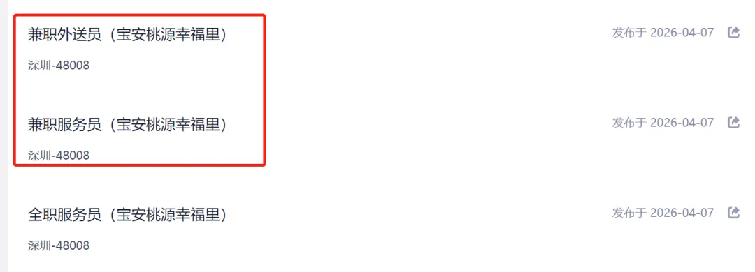 招聘兼职服务员、外送员,招聘门店及岗位展示如下