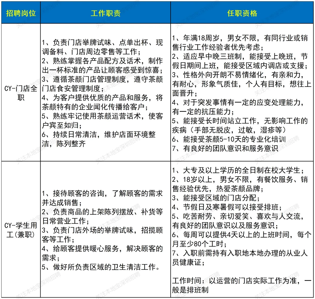 ⭐推荐服务:关注【本地宝深圳招聘】公众号,回复【茶颜悦色】,即可直达茶颜悦色招聘官网,查看深圳门店全职/兼职招聘岗位