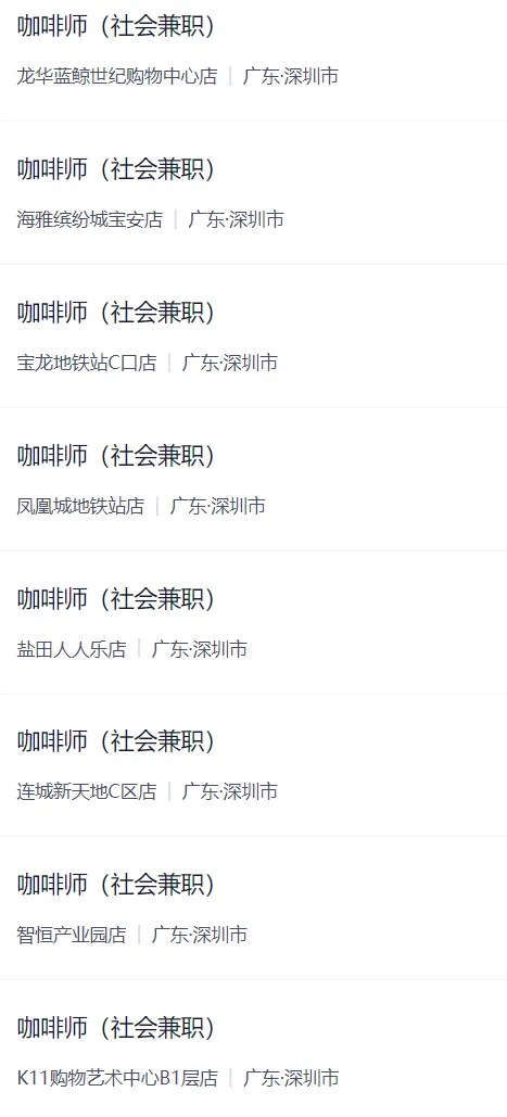 咖啡师(学生兼职、社会兼职都有)。深圳多个门店都有招聘,部门门店展示如下,全部招聘门店,可进入招聘页面查看