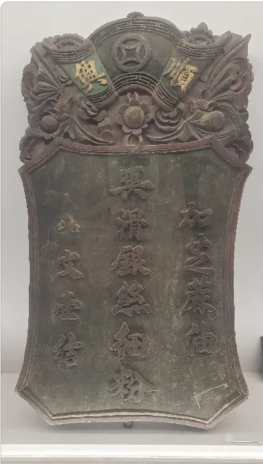 岭南地区自古商业发达,贸易兴盛。广东境内的湛江徐闻、阳江、汕头等地,均是海上丝绸之路的重要节点。作为“南大门”的广州,更是被誉为“千年商都”的主港,从唐宋直至明清时期长盛不衰。清代中后期,十三行作为仅有的对外贸易场所,甚至被称为“金山珠海,天子南库”。深圳地区也是南方海路贸易的重要枢纽,南头古城地处外洋航道要冲,屯门镇在唐代是广州对外贸易的外港,凡从阿拉伯、印度、中南半岛、南洋诸国到广州贸易的商船,必定先停靠于此。赤湾港天后庙则是“省会藩篱之地,扼外洋要害之冲”,是古代海外交通船舶的驻泊地点。民间商贸活动同样十分活跃,岭南地区俗称集市为墟市,农民、商贩和手工业者聚集在此从事交易,往往是农村经济的中心。嘉庆《新安县志》中记载的墟市多达37个,仅南头古城就有4个。由于墟市参与者不限本地人,外地商家为保护其商业利益,便在城内设立会馆、商会、会所等。位于古城中山南街81号的东莞会馆,是深圳仅存的会馆建筑,始建于清同治七年(1868年)。牌匾是工商业用以宣传生意和招徕顾客的重要广告方式,上书店号、商号或广告语等。其种类丰富,形制多样,多彩、生动、活泼地展现了过去商贸活动的面貌。清朝中期剧曲繁盛,制作戏服的商家云集于状元坊,此地曾是广东地区最大的广绣集散地,全盛时期遍布各类手工艺作坊。顾绣是状元坊制作戏服的重要技法之一,其生产的戏服极为华丽,在国内享有盛誉,甚至连宫廷戏班也曾慕名到此订做。明清时期广东地区丝织业发达,其产品成为宫廷贡品,而普通人家则多用土布。直至民国前期,土布、绸缎、针织品等仍是广东出口商品的大宗,销往外省乃至南洋地区。但传统行业因受大环境冲击和和价格等因素影响,在后期逐渐走向衰落。自古以来,患者往往通过赠送匾额的方式,来表达对医德高尚、医术精湛的医生的感激之情。“妙手回春”、“悬壶济世”、“杏林春暖”等匾额,可令医者厅堂生辉,亦可张扬医者盛名,为其招徕更多慕名而来的顾客。如果牌匾题字出自名家之手,其份量就更非同一般。古代与文体业相关的商铺如书店、笔墨店、纸张店、乐器店等,多以商品模型为招牌,或在招牌上绘有商品形象。此招牌上的“黄乙楼”则是专为他人代写文字的店铺,招牌为纯文字,表明其经营范围包括“招牌扁额祠堂大字围屏寿帐墓碑”,可用“宋体正草隶篆”。粤式糕饼种类繁多,本地特色浓厚,如杏仁饼、鸡仔饼、金钱饼、炒米饼等,均是其著名产品。广州地区特有的饼印技艺已被列为广东省非物质文化遗产,仅存的手工饼印铺创立已有百余年。此招牌上店号部分刻成石榴、桃等形状,均是表示吉祥含义的常用标志。中国的科举制度从隋唐兴起至清末废止,历时上千年,产生了深远的影响。科举考试成为古代读书人的毕生追求,与科举功名相关的匾额也最为人看重。士子通过科考或捐纳取得功名后,由朝廷授予题写有功名等次的匾额,以彰显其身份与荣耀。匾额的题写者多为高级官员,他们往往有极高的书法造诣,榜书大字具备较高的观赏性。除了朝廷授予的匾额外,官员也常常向士子题赠匾额,以表庆贺勉励,题词多引经据典,文辞凝练。科举匾额作为中国古代科举制度的产物和见证,为人们了解古代科考打开了一扇窗。木质,有手把,漆大红色。封建官员出行、出巡所用仪仗的一部分,除官衔牌以外,还有回避、肃静、铁链、木棍、乌鞘鞭、金瓜、尾枪、乌扇、黄伞等随行仪仗。此外,还要"鸣锣开道",吆喝行人回避。仪仗的使用有严格的规定,体现了封建等级的区别。清咸丰五年抗英惠州知府江国霖题“职佐巡政”匾