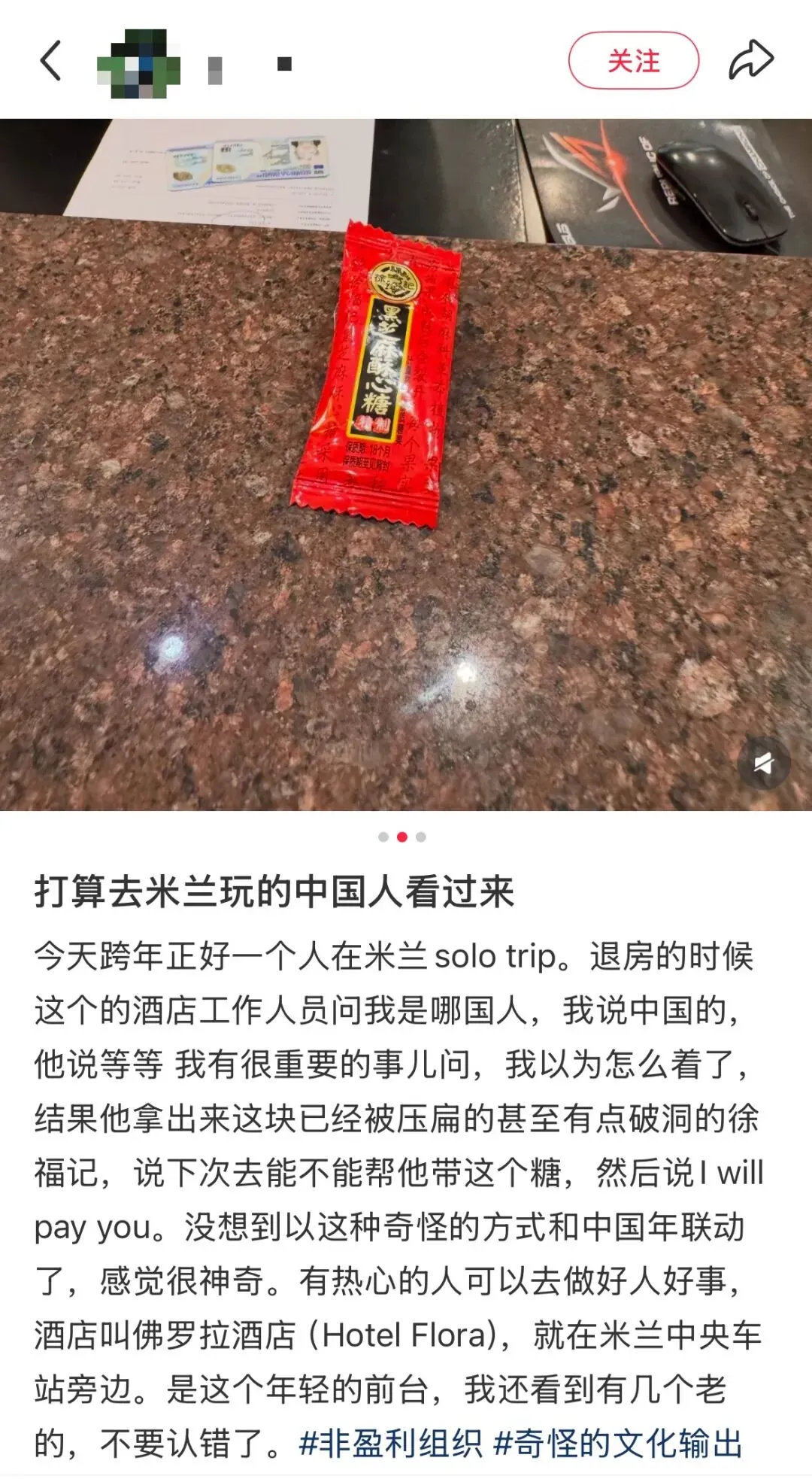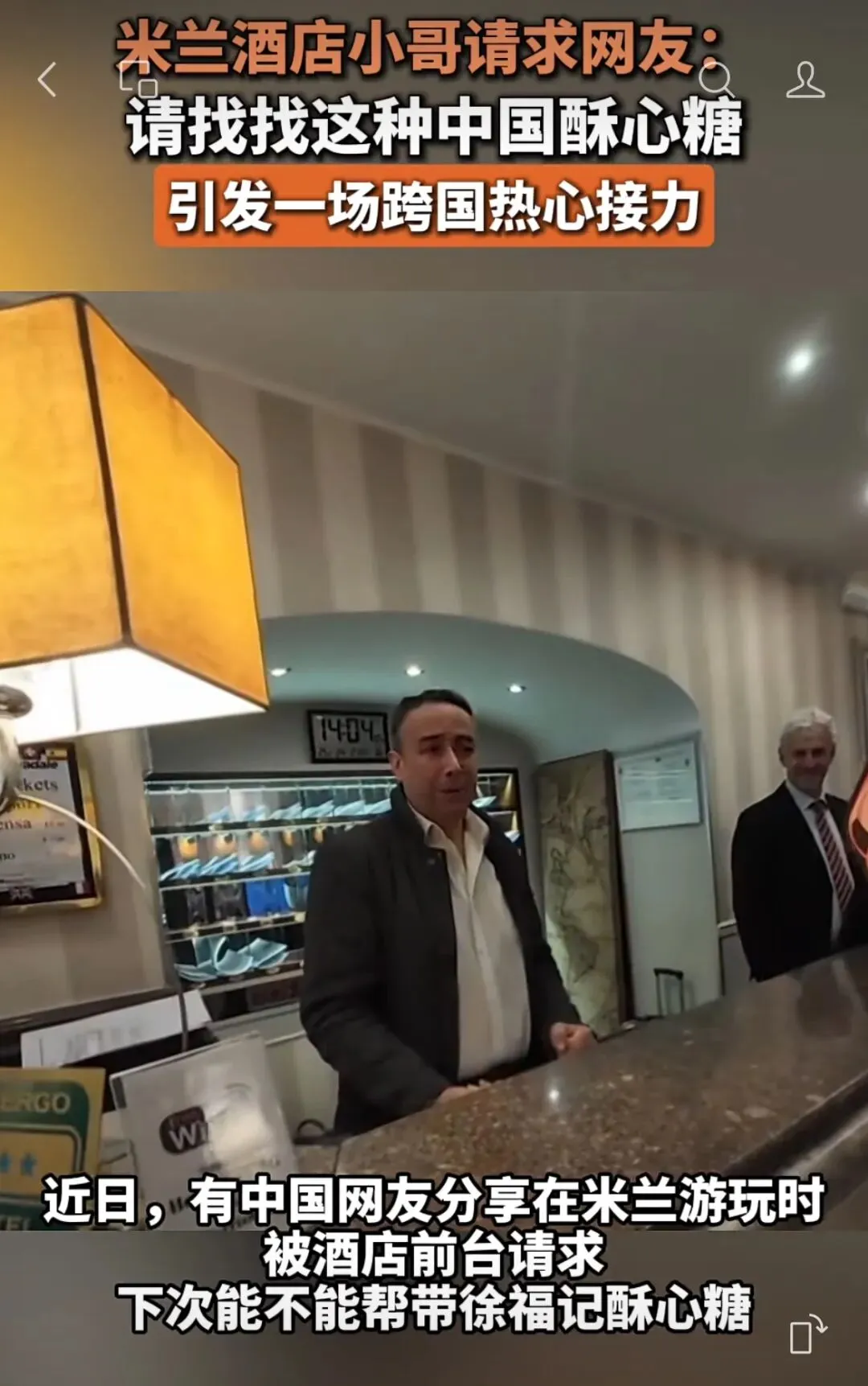 起因是一位中国游客给了他一颗酥心糖,他尝完后连连称赞。今年2月,他拿着那张保存平整的糖纸,再次请其他中国游客帮忙代购酥心糖的视频意外火出圈,不少网友甚至专程去酒店给他送糖。这颗糖,从此成为米兰小哥念念不忘的“中国味道”。