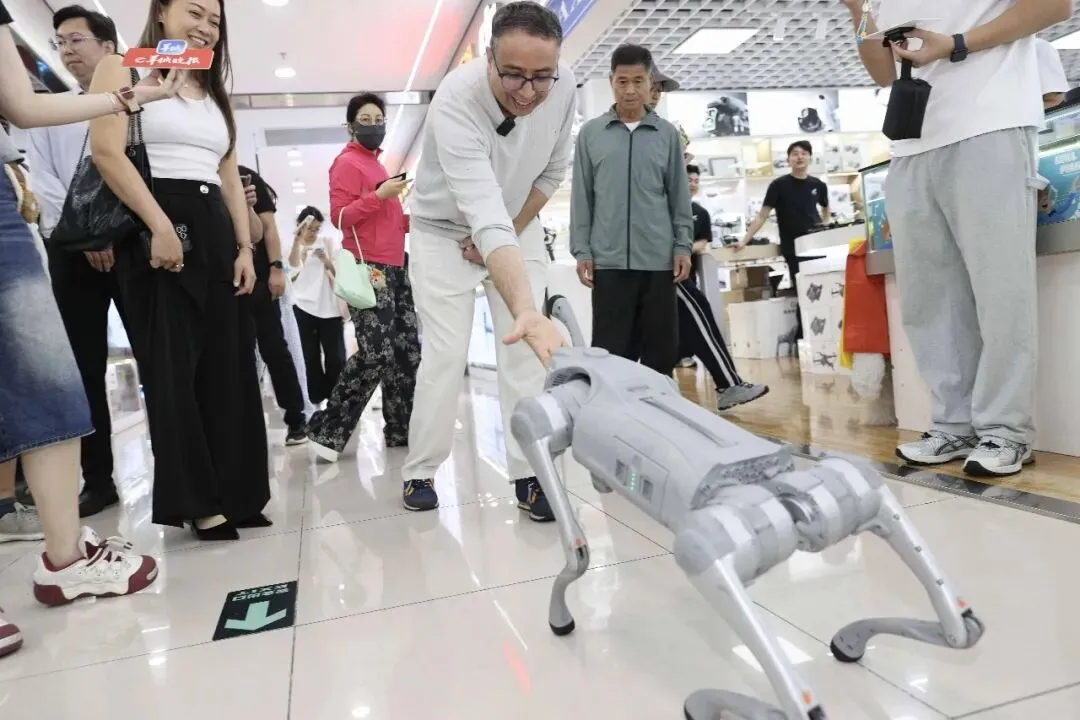 如果说无人机让卡雷姆震撼,那么后续的探索则让他彻底“破防”。在悦鑫宇智能健康馆门前,一只活泼的机器狗主动伸出“手”与他握手,逼真的动作让他感慨,“以前只在视频里看过,没想到现实中这么真实,动作就像真的狗狗一样!”而真正让他迈不动步的,是店内的一副AI眼镜。