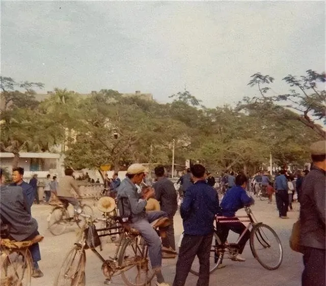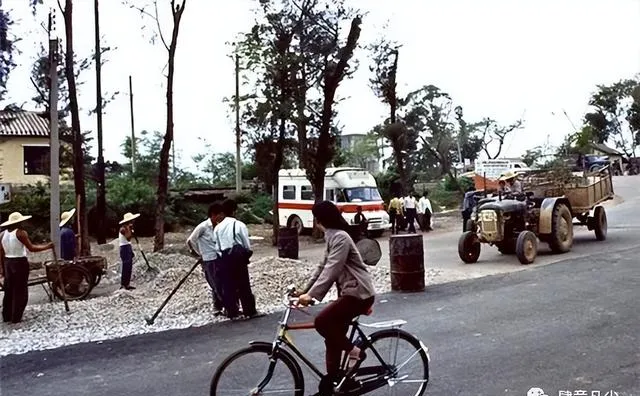 图里这条马路,一看就是早年深圳人的生活缩影,马路还没现在宽敞,只能并排过几辆自行车,路边是三五成群穿蓝工服的工人在忙活,有人推着小推车,有人拿铁锹站在一旁谈着什么,身后的树光秃秃的,顶上吊着电线,远远看还有一辆救护车停着,那是很多人记忆中深圳建设初期的味道,我爸说,"以前就是从这样尘土飞扬一步步干起来的,哪像现在高楼林立"。