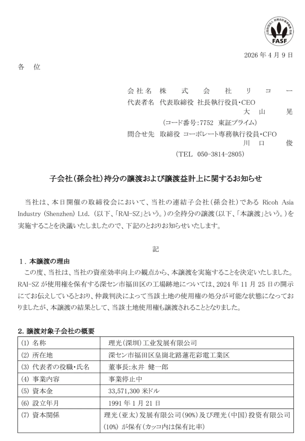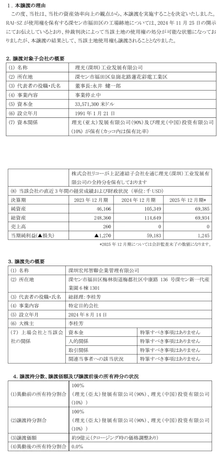2026年4月9日,日本理光集团发布公告,确认以约9亿元人民币的价格,出售其位于深圳市福田区的子公司——理光(深圳)工业发展有限公司的工厂旧址。接盘方为一家深圳本地企业。这座曾占理光全球复印机产量40%以上的制造基地,在停产6年后,正式完成了资产的最终处置。