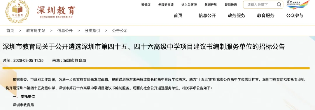 3月5日上午,深圳市教育局官网连续发布两则招标公告,分别是《关于公开遴选深圳市第三十九、第四十高级中学项目社会稳定风险评估报告编制服务单位的招标公告》以及《关于公开遴选深圳市第四十五、四十六高级中学项目建议书编制服务单位的招标公告》。