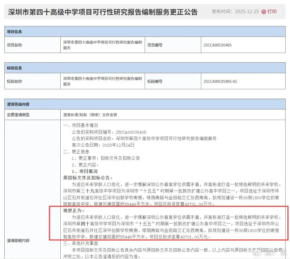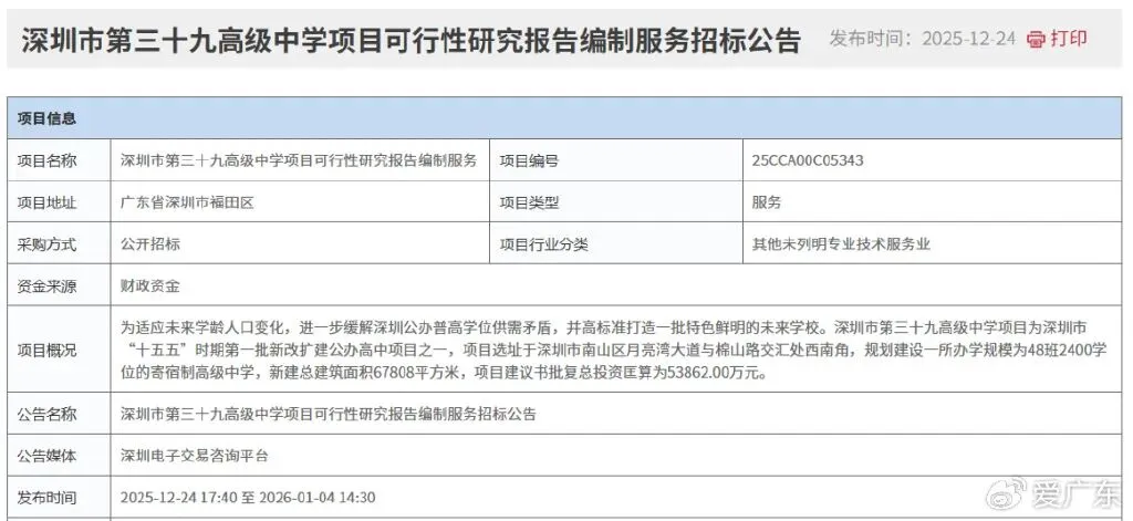 招标公告介绍,这四所高中都是深圳市“十五五”期间项目。市教育局的招标方案指出,深圳市第三十九、第四十高级中学是深圳市“十五五”时期第一批新改扩建公办高中项目。