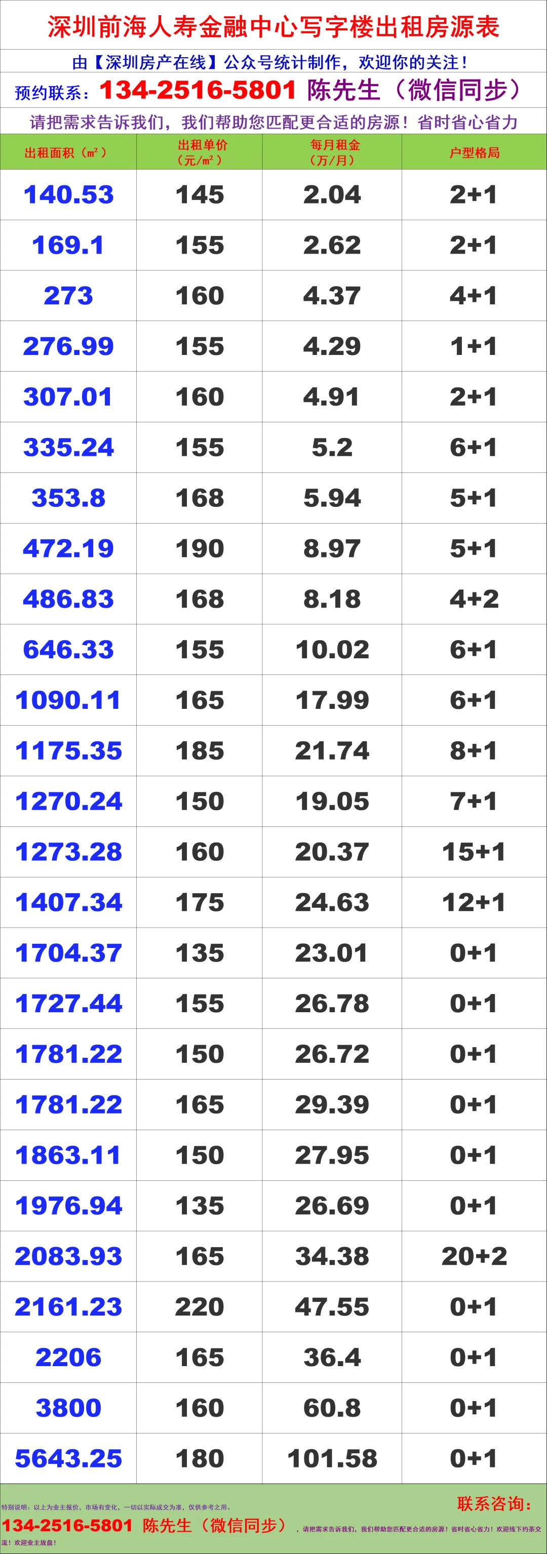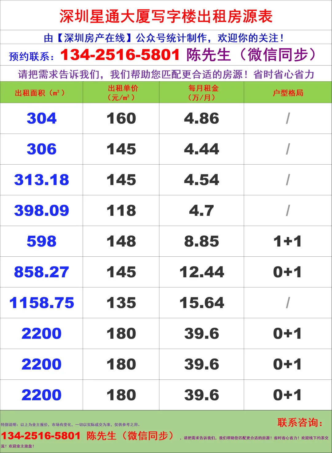 【深圳房产在线】陈经理写字楼租售团队:134-2516-5801 (微信同步)