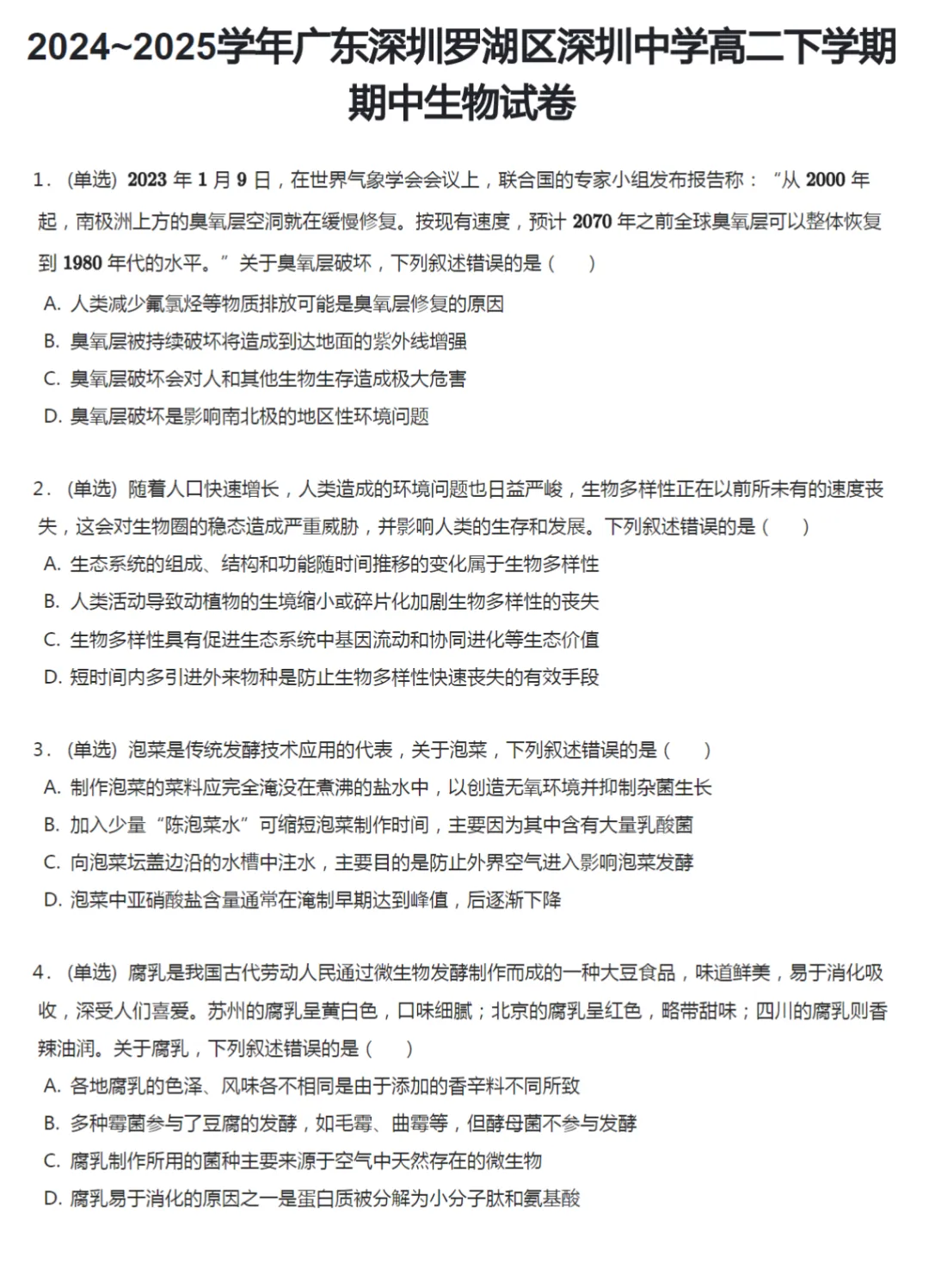 40套2015-2025学年广东深圳高二下学期期中生物试卷及答案解析