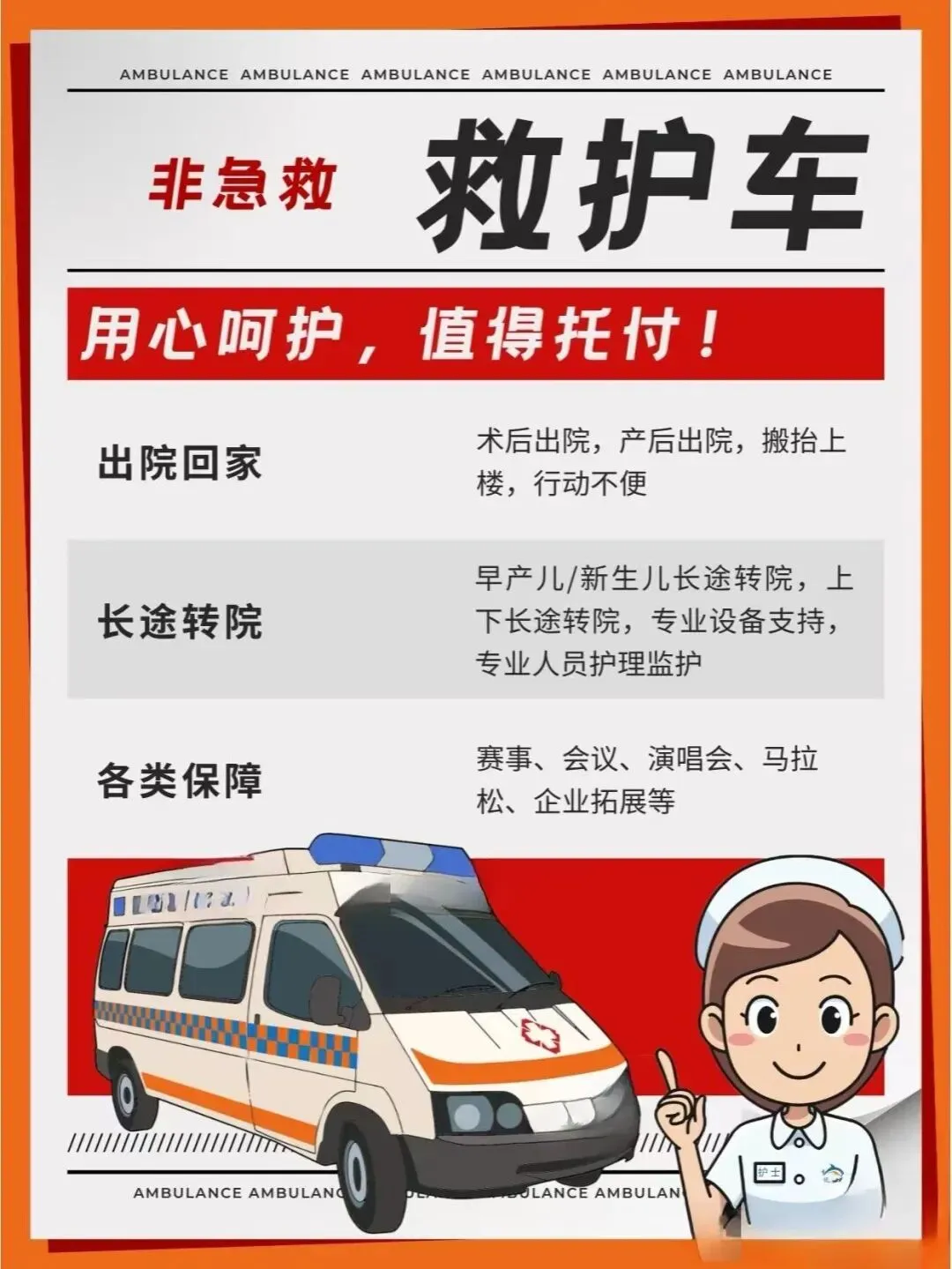 我们专注非急救医疗转运,覆盖 120 非急救转运、长途 / 跨省病人转运等全场景,承接新生儿、骨折患者、重症患者、行动不便者复查转院、跨省返乡、遗体转运等各类需求,以专业设备与团队,全程保障安全、稳妥、贴心。
