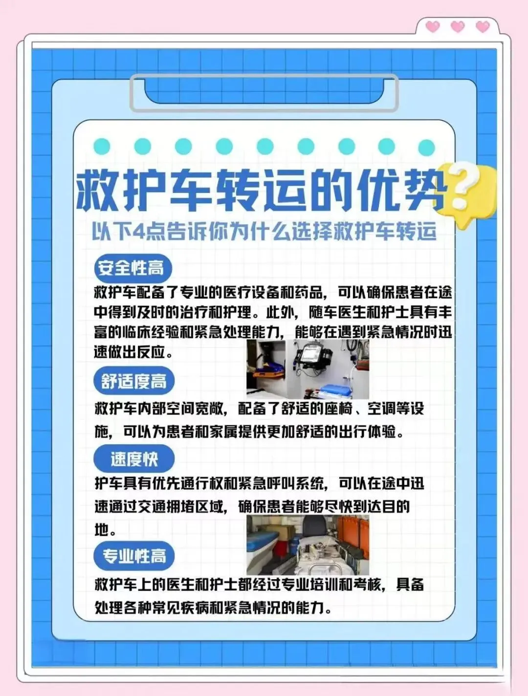 每辆救护车均配备全自动呼吸机、心电监护仪、吸痰器、呼吸气囊、供氧系统、担架床等专业设备,医护团队根据患者情况灵活应对,筑牢转运全程医疗保障。