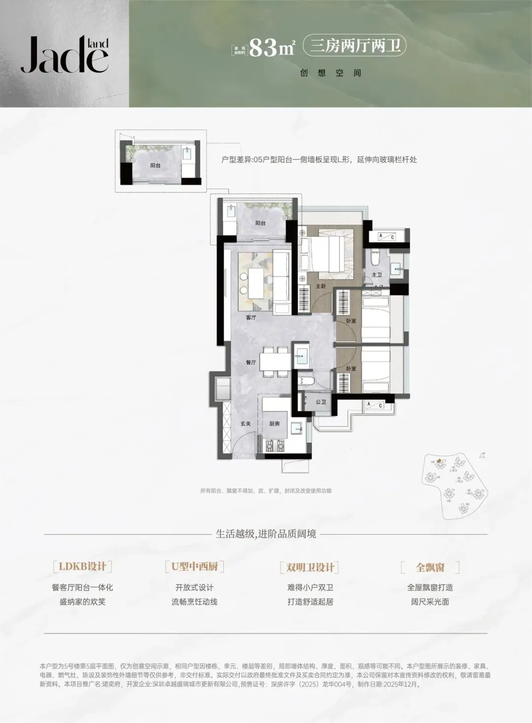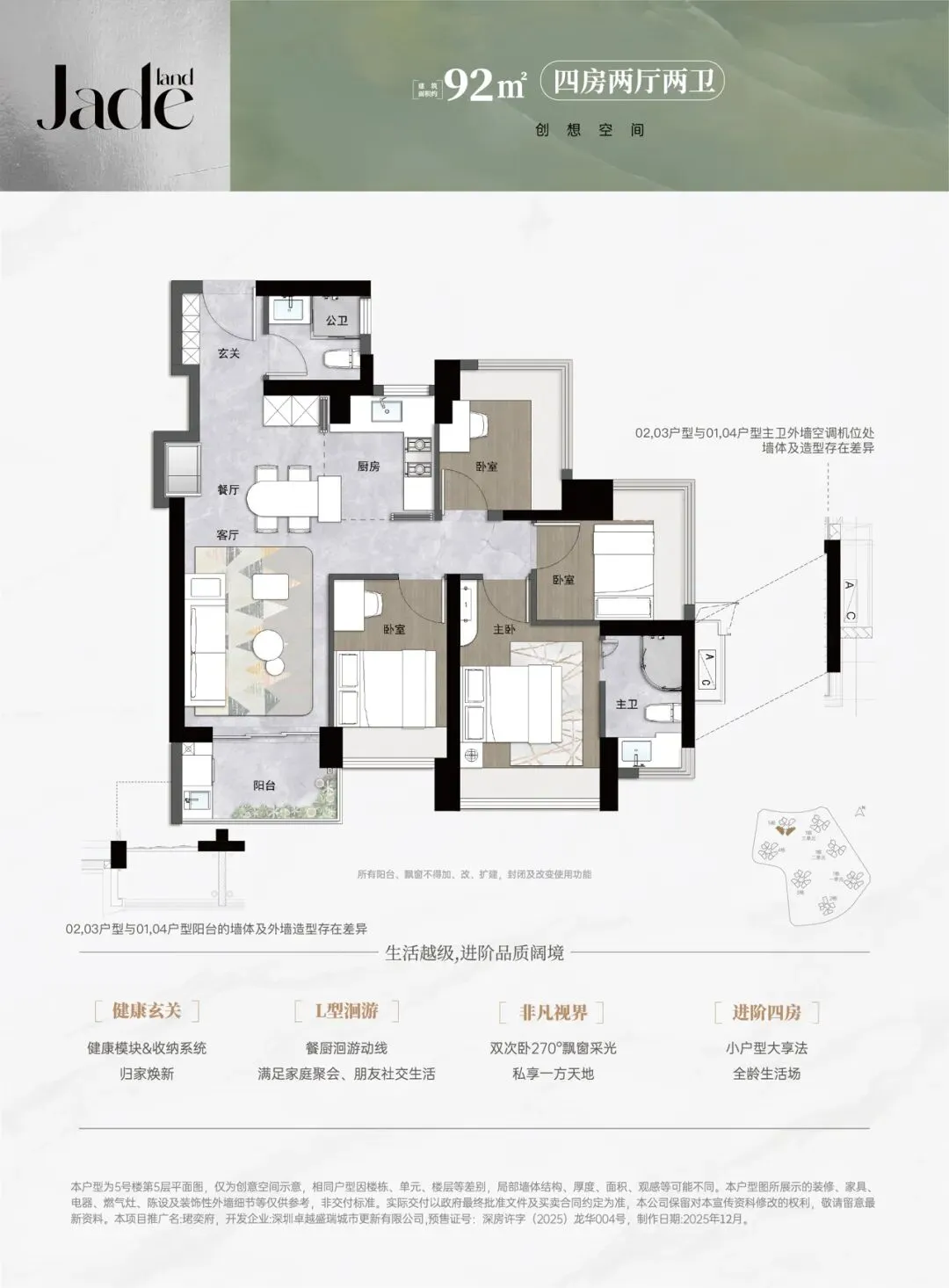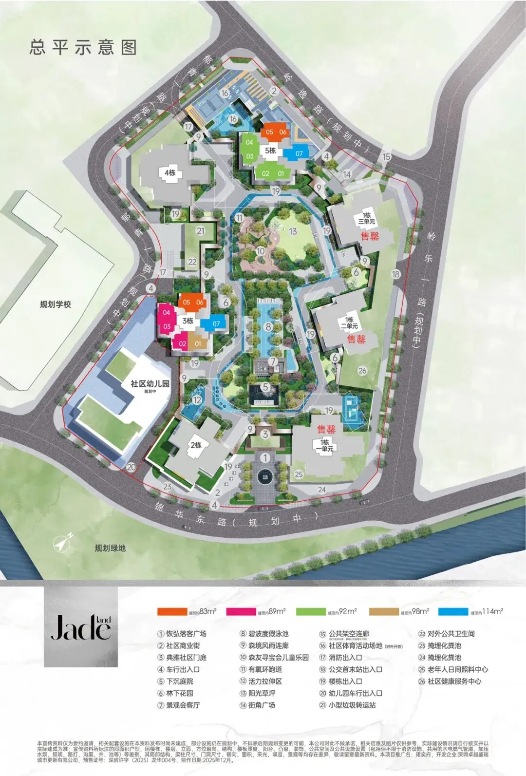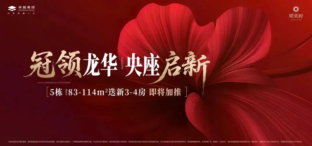 卓越君奕府二期(备案名:卓越珺奕府二期)位于深圳市龙华区大浪街道龙坂大道与锦华南路交汇处,地处龙华“数字龙华、都市核心”战略核心发展轴,紧邻红山-上塘高端居住区。项目由深圳卓越盛瑞城市更新有限公司开发,属于卓越集团“奕系”高端产品线。总占地面积约3.26万㎡,总建筑面积约31.4万㎡,计容建筑面积约22万㎡,容积率6.75,绿化率40.13%。项目分2期开发,共7栋48-49层高住宅,6栋是1所12班制幼儿园。总规划2136户,规划停车位2343个(含充电桩车位703个),车位比约1:1.1。二期分为两次推售:2025年4月首推3栋,户型为建面约83-89㎡三房两卫、98-114㎡四房两卫,共311套房源;2025年11月加推5栋(楼王单位),户型再次升级,实现92㎡四房两卫,共315套房源。