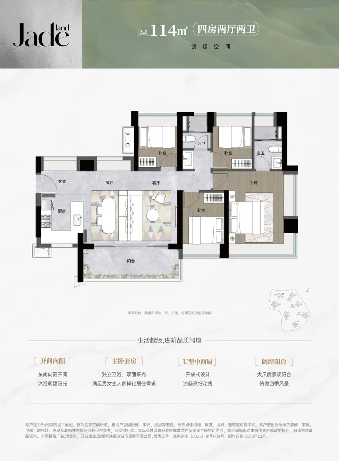 114㎡四房两卫:LDKB一体化设计、270°转角飘窗、部分户型五开间朝南