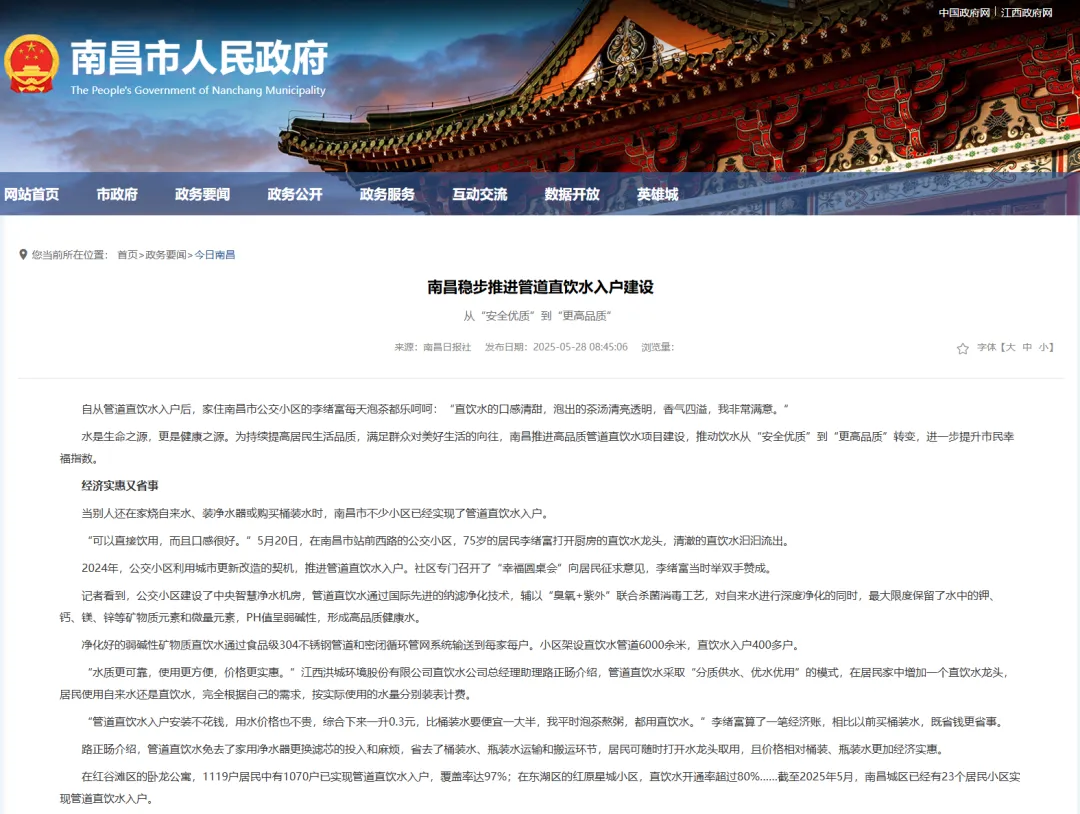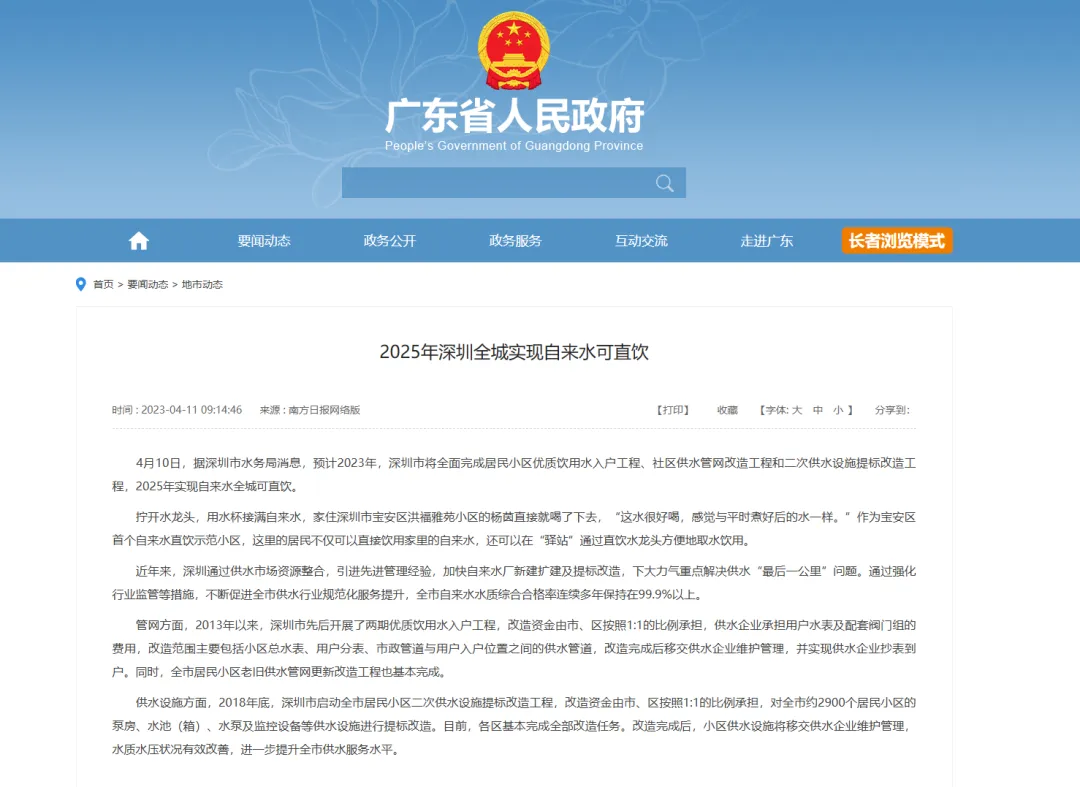 广东省政府网站《2025年深圳全城实现自来水可直饮》http://www.gd.gov.cn/gdywdt/dsdt/content/post_4151706.html南昌市政府网《南昌稳步推进管道直饮水入户建设》http://www.nc.gov.cn/ncszf/jrnc/202505/54727888a8af498f8419d95398fe0cce.shtml