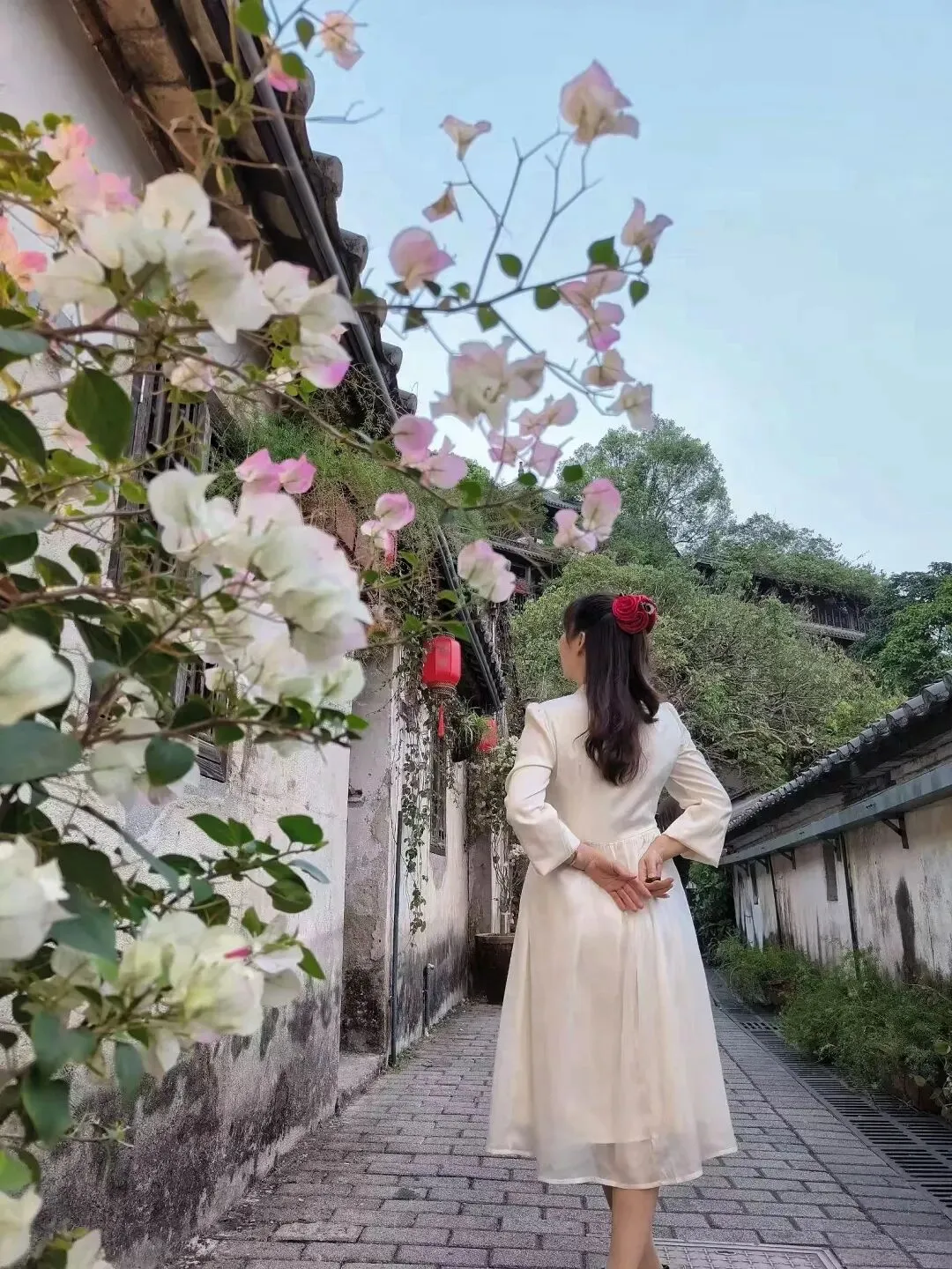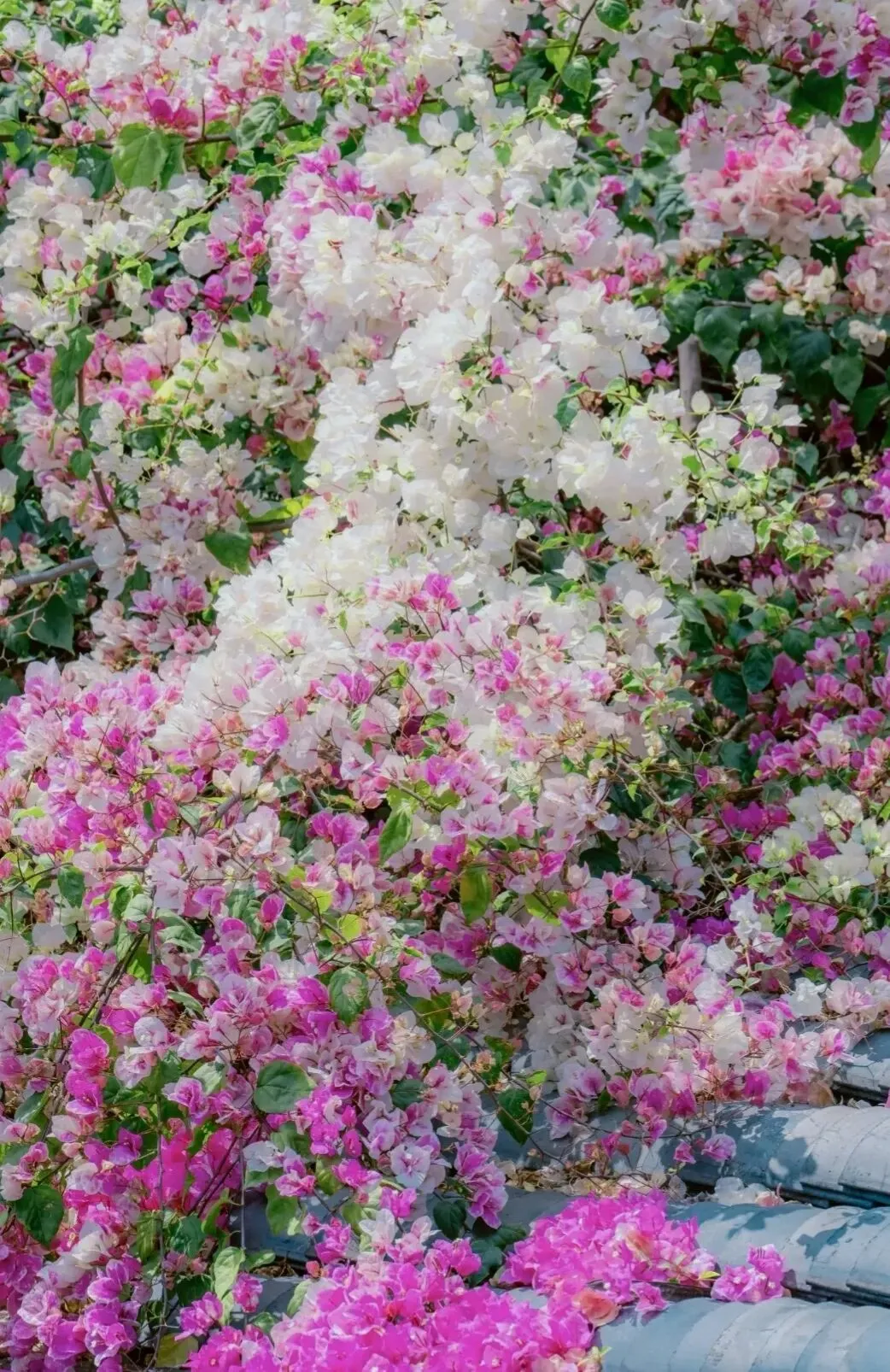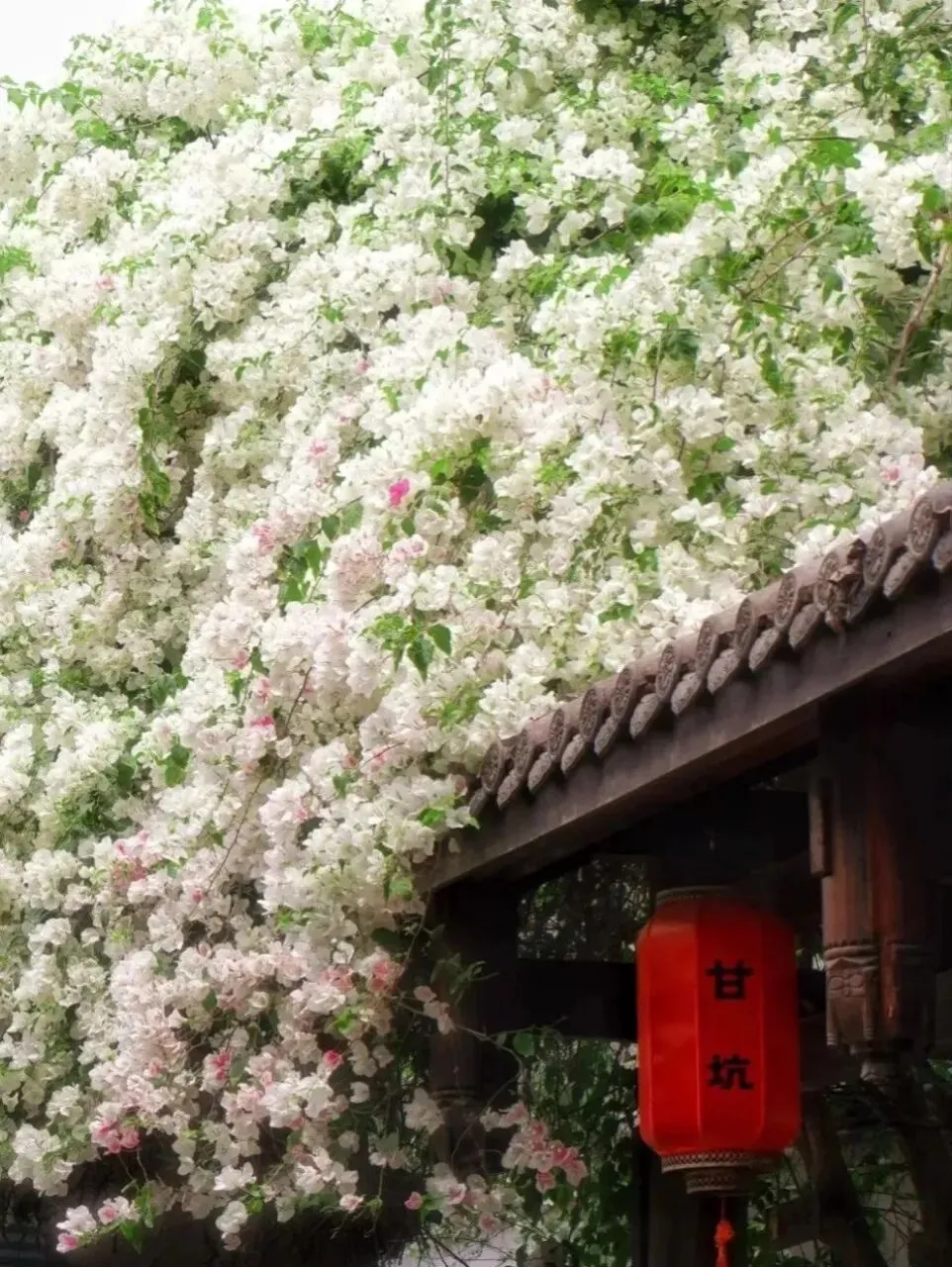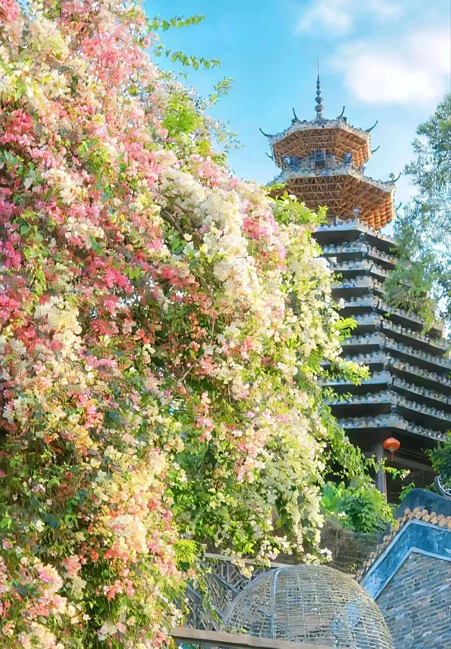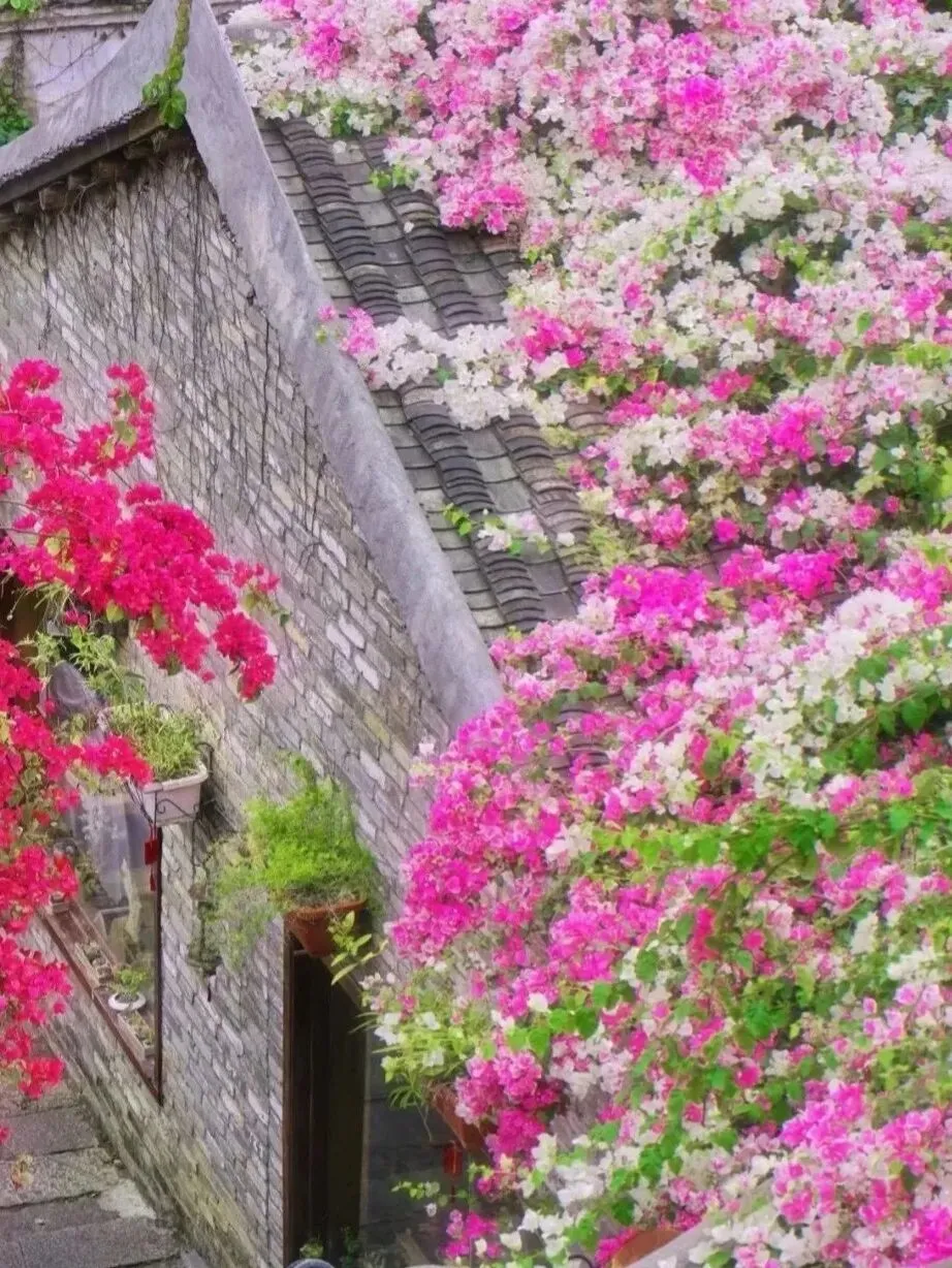 粉的、白的、玫红的花团,顺着青瓦屋檐肆意垂落,层层叠叠织成半透明的花帘。风一吹,细碎的花瓣簌簌往下掉,落在青石板路上,也落在行人的发梢,连空气里都飘着温柔的甜香。
