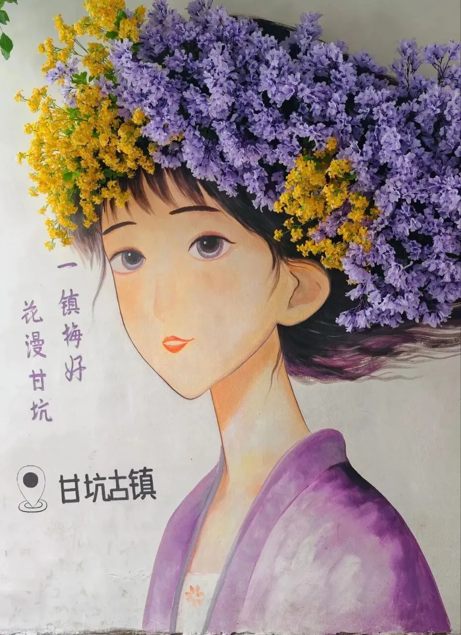 连那幅“花漫甘坑”的墙绘,都被真实的花簇温柔簇拥,分不清是画里的人走进了花里,还是花落在了画中。