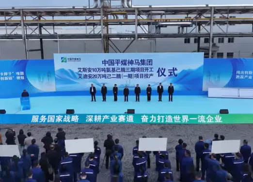 4月9日,中国平煤神马集团艾斯安10万吨氨基己腈三期项目开工、艾迪安20万吨己二腈(一期)项目投产仪式在平顶山尼龙新材料开发区举行。