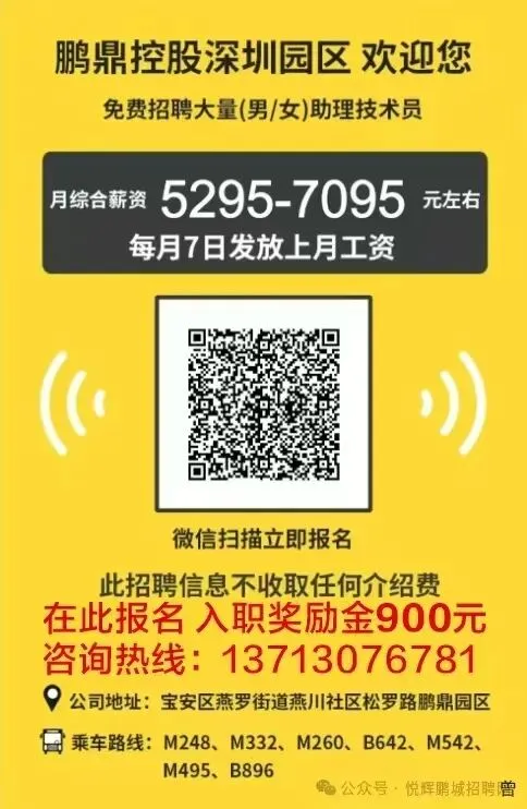 深圳松岗鹏鼎控股电子厂大量招聘男女普工(月薪5295-7095元+新人入职奖900元)宿舍体检免费、全天热水 五险一金 7号发放上月工资.