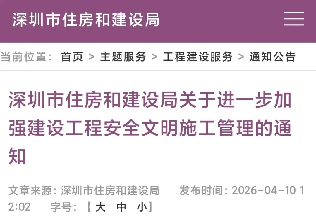 “ 以文明促安全、以安全固文明”,重视和提升安全生产和文明施工水平是工程高品质建设的必要保证,是助力城市高质量发展的重要举措。为贯彻落实《深圳市建设工程文明施工品质提升行动方案》(深建文〔2026〕18号)的有关要求,进一步加强全市建设工程安全文明施工管理,规范安全文明施工措施费用的使用,切实提升施工现场组织的标准化、规范化、精细化水平,营造安全稳定、整洁有序的良好施工环境,现就有关事项通知如下: