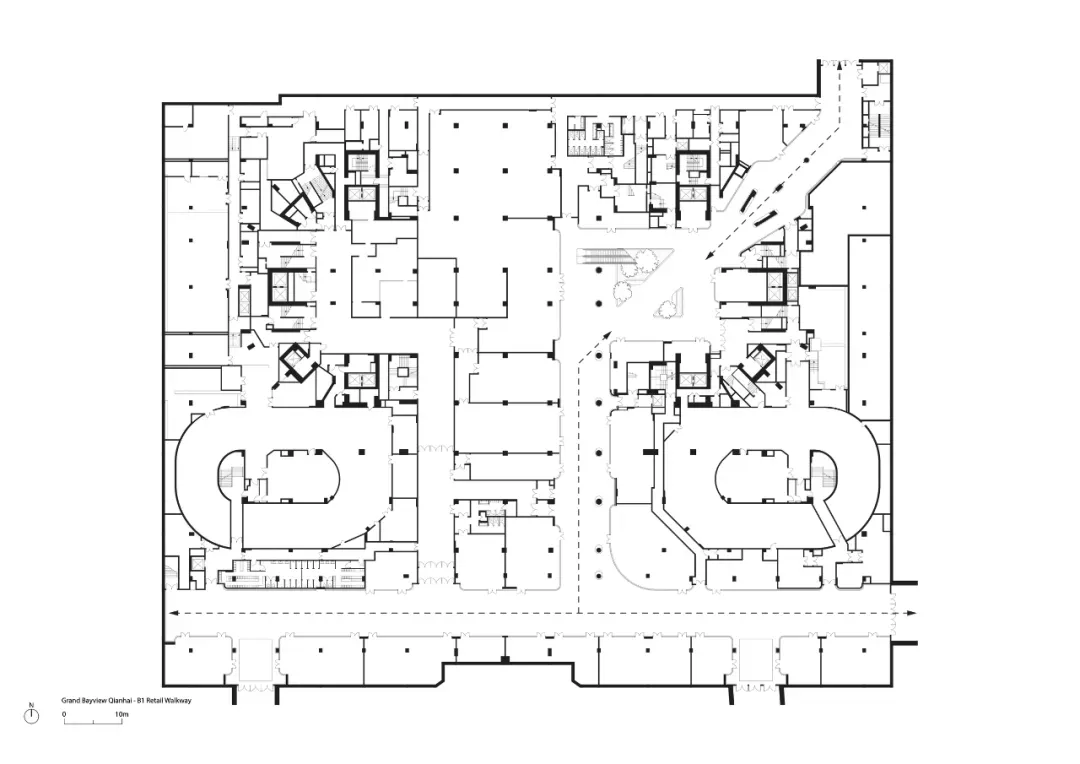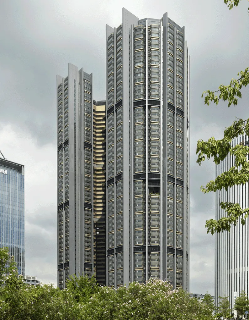 该建筑由福斯特建筑事务所(Foster + Partners)设计,两座相连的塔楼呈扇形布局,以优化视野和采光,在外围半径处最大程度保障私密性,并在规划的中心区域打造集中的公共活动空间。