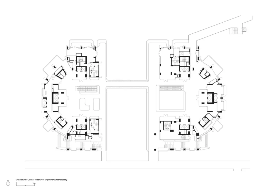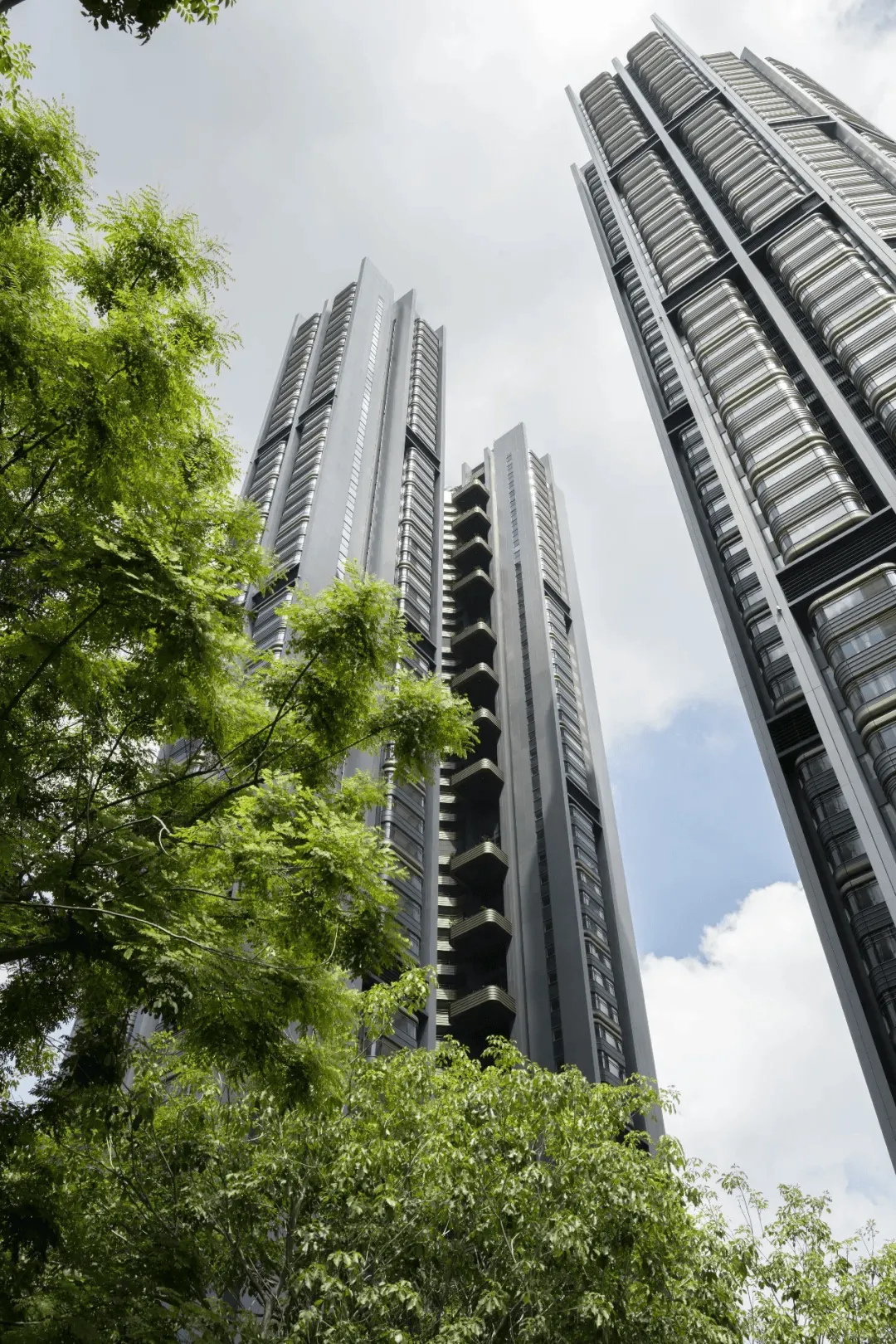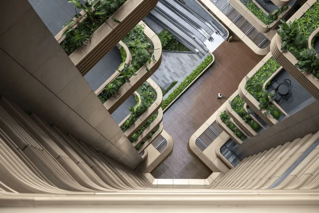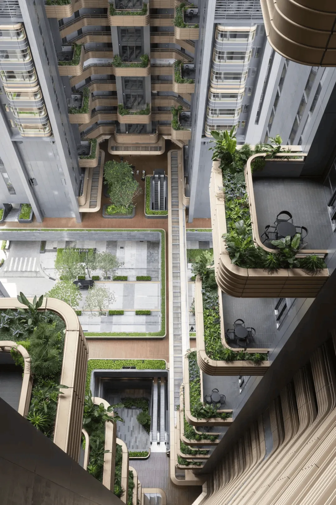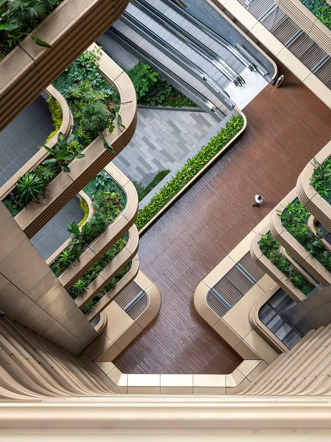两座公寓塔楼高达 180 米,通过一座大型半公共花园相连,该花园与周边绿地相接,在地面层拓展了项目的体验空间。二层的露台与桂湾的高架步行系统无缝衔接,为周边地块提供了过渡空间,并为公众打造了一处城市绿洲。