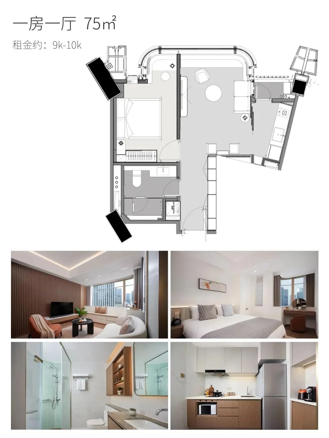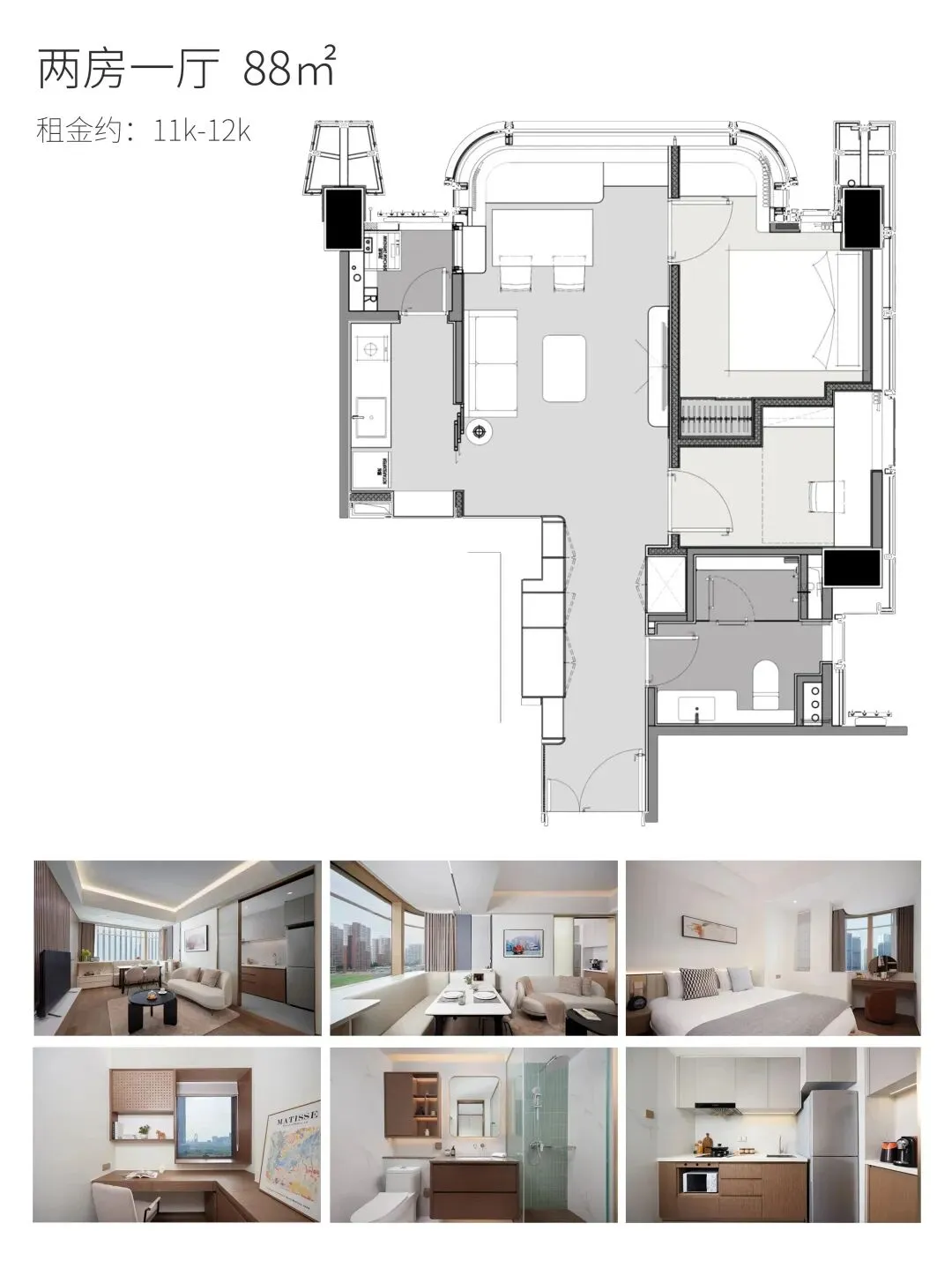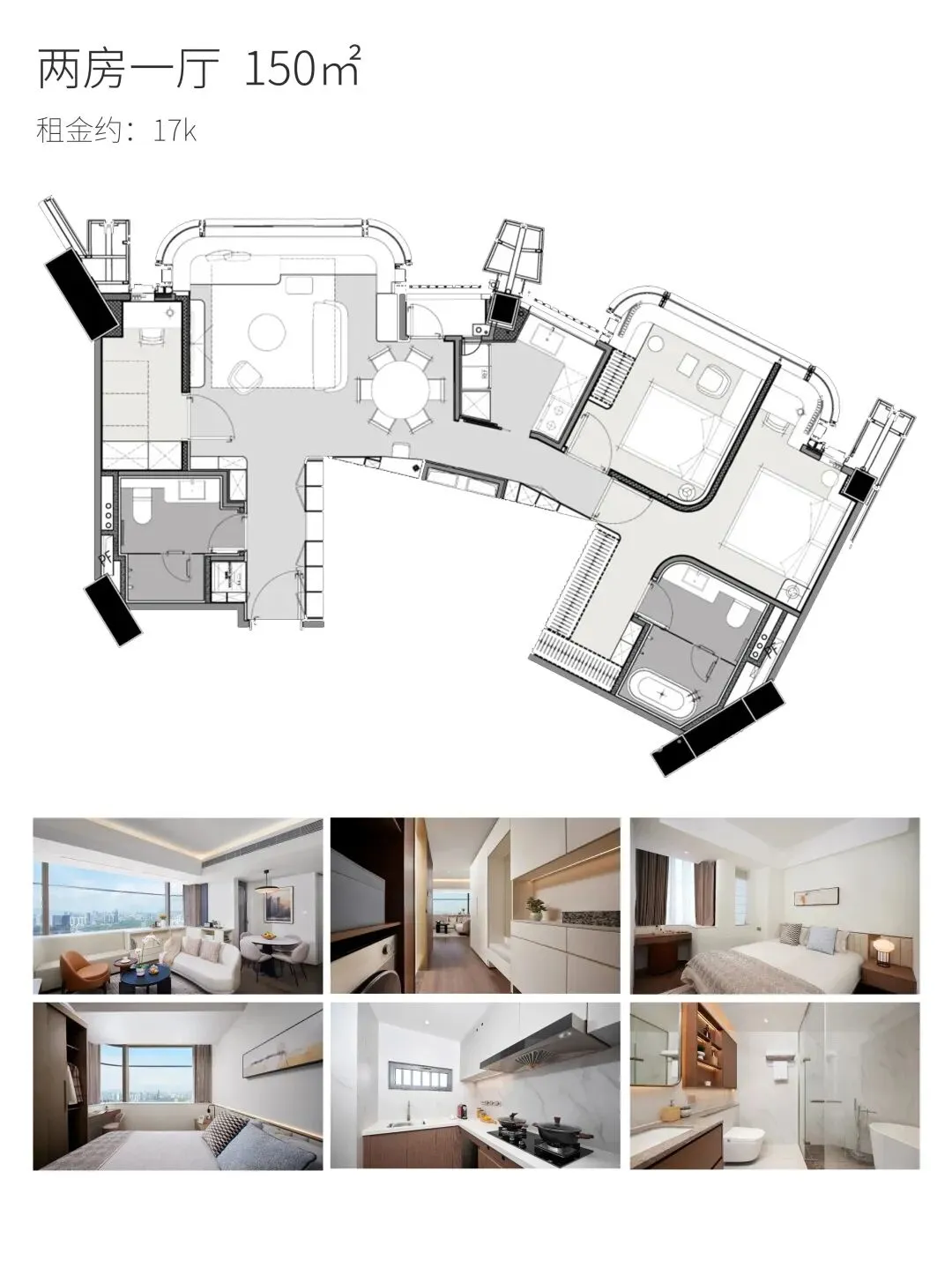 启用当日同步启动常态化配租,首批开放T2栋544套服务式公寓,户型涵盖75㎡一房、88㎡1+1房及150㎡三房,月租统一155.9元/㎡。