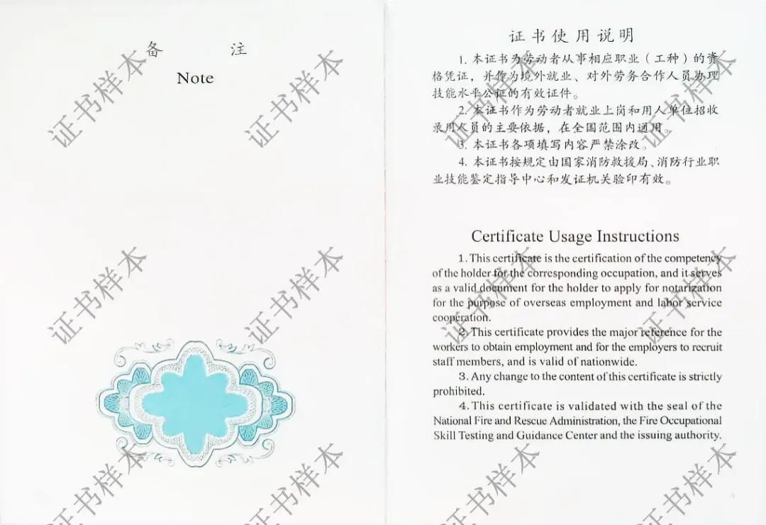 新版消防行业职业资格证书内四、封三式样(四级/中级工)