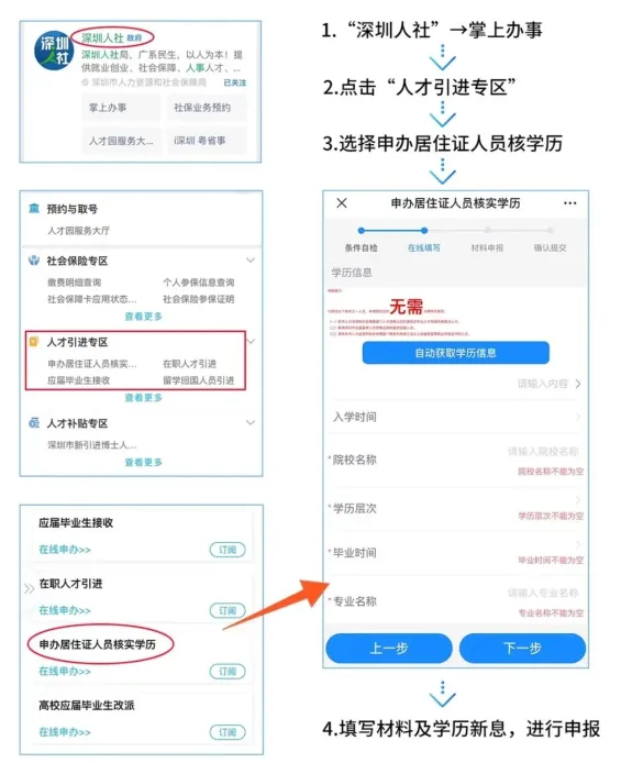 人才引进学历认证流程:搜索深圳人社—掌上办事点击人才引进专区选择申办居住证人员核学历。