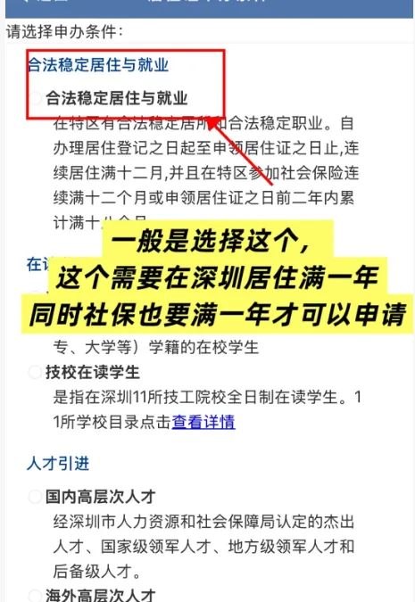 根据自己情况选择;一般选着合法稳定居住就业(这个需要在深圳粤居码里面登记居住信息满一年+社保交满一年才能申请);