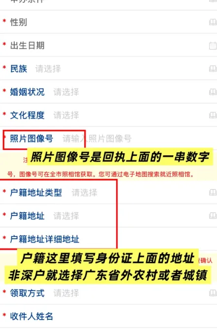 户籍地址填写就填写身份证上面的地址就好了,非深户选择广东省外农村或者城镇、选择证件领取方式无误后点击提交。