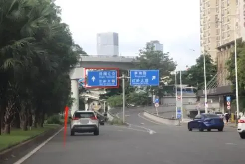 3. 下桥后走左侧车道,右转进宝安北路