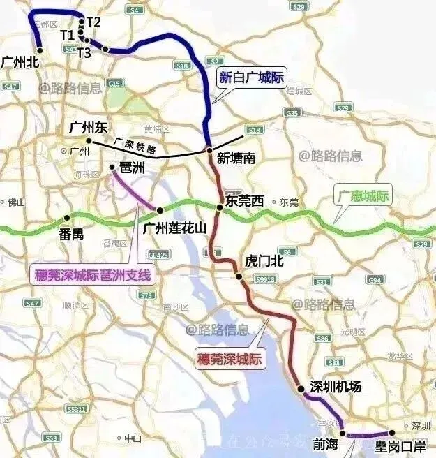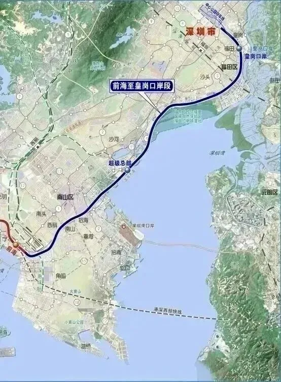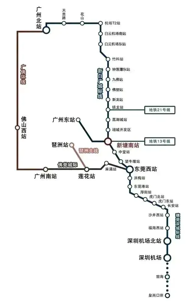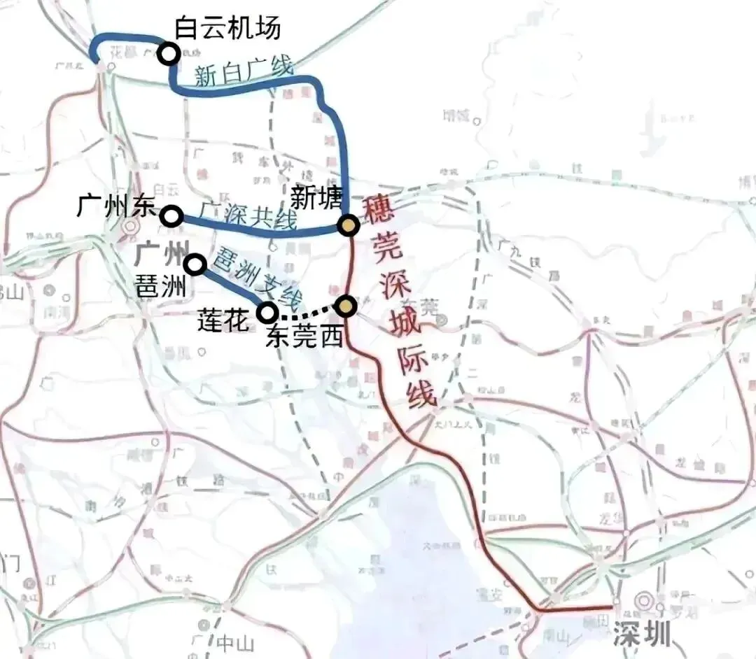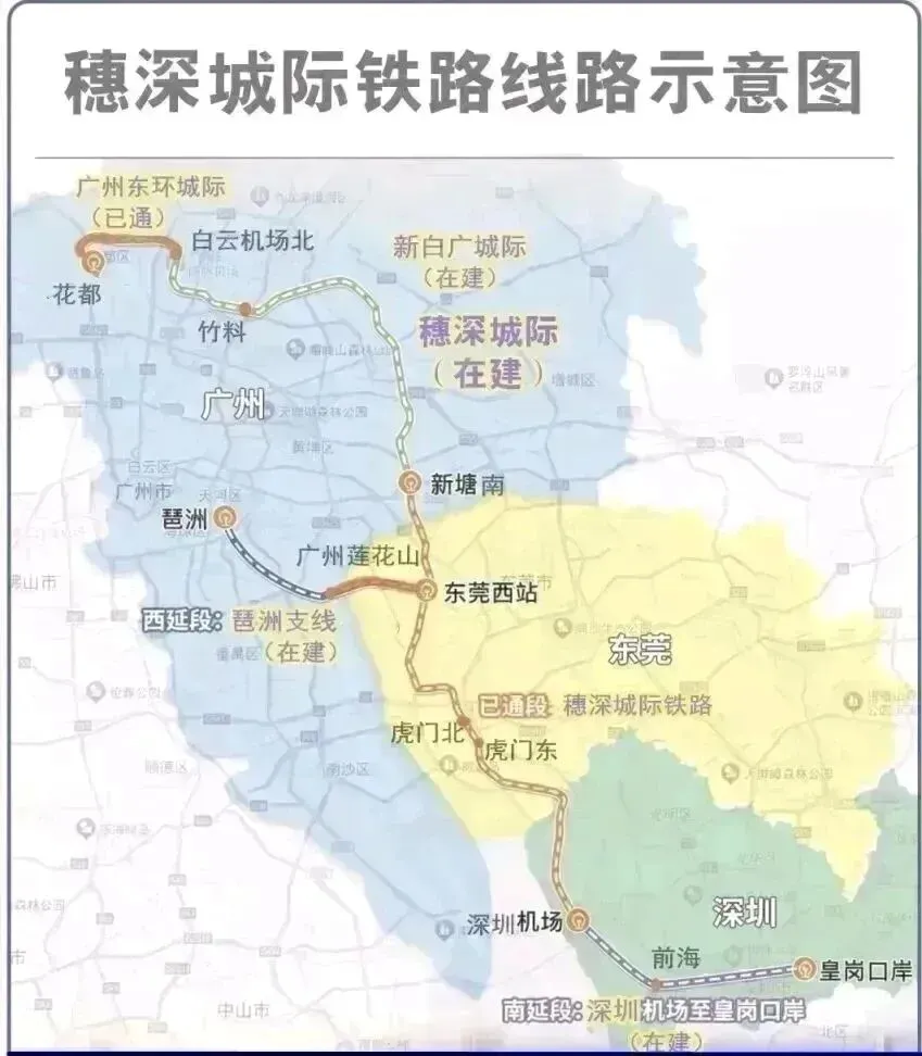 整个工程划分三期建设:广州新塘至深圳机场段;深圳机场至前海段(简称“机前段”);前海至皇岗段(简称“前皇段”)。其中,广州新塘到深圳机场段2019年12月已开通运营。目前,机前段、前皇段正在全力建设中。此外,穗莞深城际还包括广深共线、新白广城际线、琶莲城际(原名琶洲支线)。穗莞深城际全长76.108公里,全线设新塘南、中堂、望牛墩、东莞西、洪梅、东莞港、厚街、虎门北、虎门东、长安西、长安、沙井西、福海西、深圳机场北、深圳机场等15个车站,其中厚街站、虎门北站、虎门东站、深圳机场北站、深圳机场站为地下站,其余均为高架站,设计速度140公里/小时。穗莞深城际铁路连接广州、东莞、深圳三市,经琶洲支线、深圳机场至前海段引入广州市、深圳市中心城区。项目自穗莞深城际深圳机场站(不含)引出,经宝安区、前海合作区,至前海站(含),线路全长15.2公里,设西乡、宝安、前海3座地下车站,预留皇岗口岸方向延伸条件,设计时速160公里,投资估算总额113.17亿元。项目预计2026年底建成通车。项目自穗莞深城际前海站(不含)引出,经前海合作区,南山区、福田区,至皇岗口岸站(含),线路全长20.5公里,设超级总部、皇岗口岸2座地下车站和中心公园地下存车场1处,预留与常龙城际(广深中轴城际)贯通条件,设计时速160公里,投资估算总额144.37亿元。位于广州市主城区东部,为穗深城际铁路进城段。线路从新塘南站引出,向北直角上跨新白广线折向西后并入广深铁路Ⅲ、Ⅳ线;奥体中心和石牌村设站,最后接入广州东站;由西向东串联天河区、黄埔区和增城区;该路段与广九铁路、广深铁路、广梅汕铁路和广汕高速铁路并行。新白广线全长约78公里,线路起点为新塘站,向北经增城经济技术开发区、中新广州知识城、广州白云机场至终点广州北站。途经广州花都区、白云区、黄埔区和增城区境内,是广清城际、莞惠城际、穗莞深城际的连接线。全线设车站13座。琶莲城际(原名琶洲支线)是穗莞深城际铁路进入广州市核心区的重要通道。项目在琶洲站与广佛环线接轨、在莲花站与佛莞城际接轨,线路起于广州市琶洲站,向东南方向经大学城东、化龙,终至佛莞城际广州莲花山站,线路全长约18公里。琶洲支线设琶洲、大学城东、化龙、莲花共4座车站,其中首尾站琶洲站和莲花站为其他项目接轨站,中间站大学城东站和化龙站为本项目新建车站。线路在琶洲站与广佛环线衔接、在莲花站与佛莞城际衔接。设计速度160公里/小时。穗莞深城际铁路这条广深客运大通道使广州、东莞和深圳三地与珠江东岸的诸多地区进入“一小时经济圈”,是珠江东、西岸广州、东莞、深圳、佛山等城市之间相互沟通的重要城际铁路通道。项目全部线路建成后,既打通广深莞快速直连,又激活前海与宝安发展动能,是支撑粤港澳大湾区一体化与深圳西部能级跃升的核心工程。更重要的是,它还能联动港深西部铁路(规划中),未来有望实现香港北部都会区与前海、南沙的直连直通,让大湾区的人流、物流、资金流、技术流,流动得更顺畅。