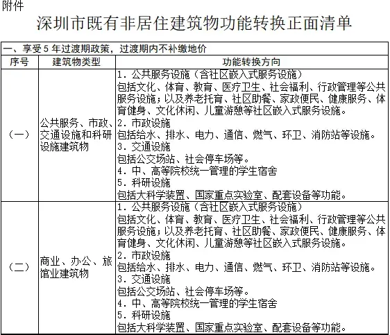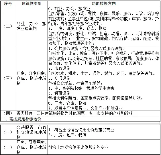 包括:①公共服务、市政和交通设施建筑物,在符合土地混合使用比例规定的前提下,可转换为商业或厂房、仓库、物流;