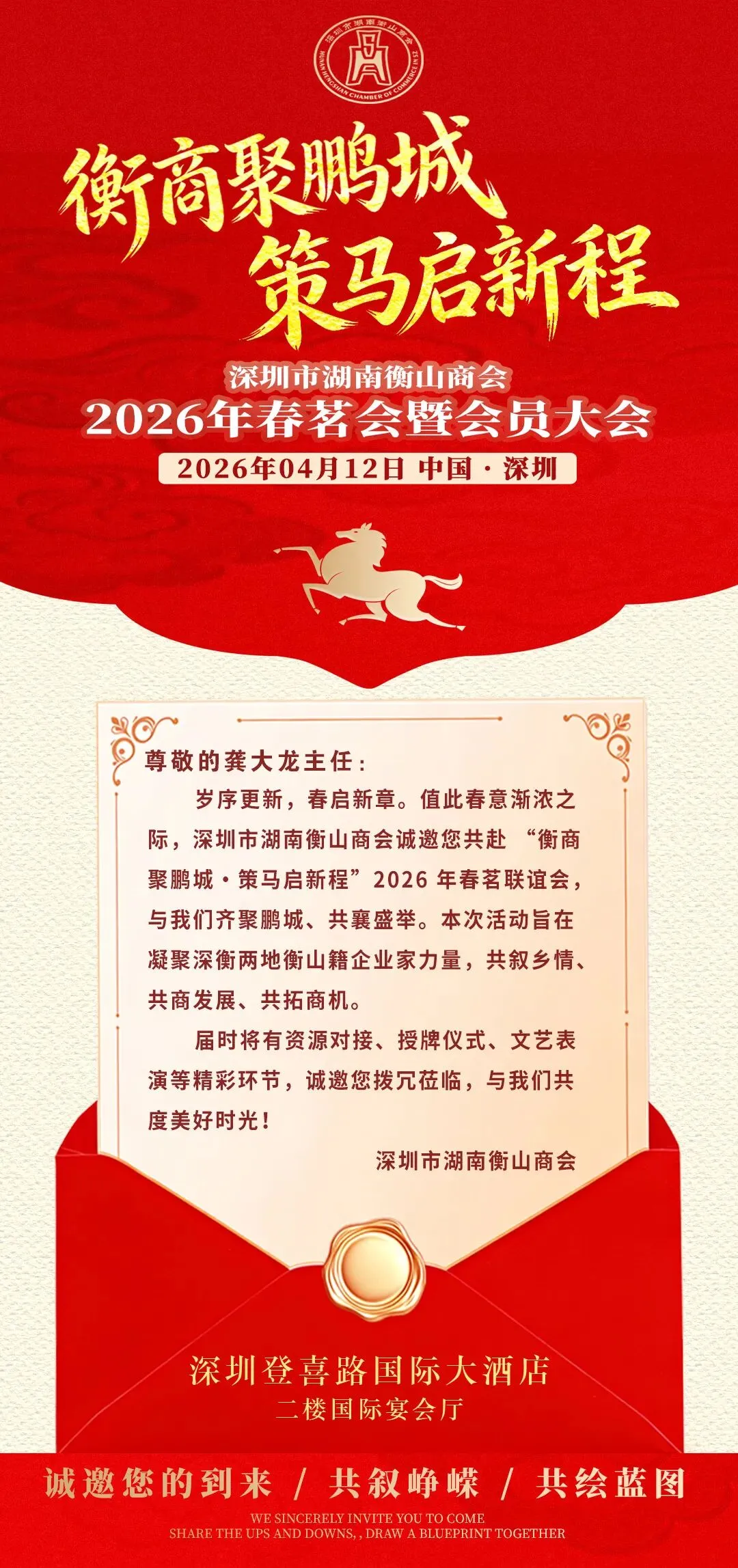 2026年4月13日,深圳市湖南衡山商会2026年春茗会暨会员大会在深圳举行。湘粤两地政府相关部门领导,商会顾问和特邀嘉宾,粤港澳大湾区友好商协会会长和秘书长,工商界知名人士,行业专家,优秀企业家,媒体记者,深圳市湖南衡山商会全体会员等共同参会。交流促发展,合作谋共赢,广东营商服务中心主任、湾区湘商秘书长龚大龙应邀出席。