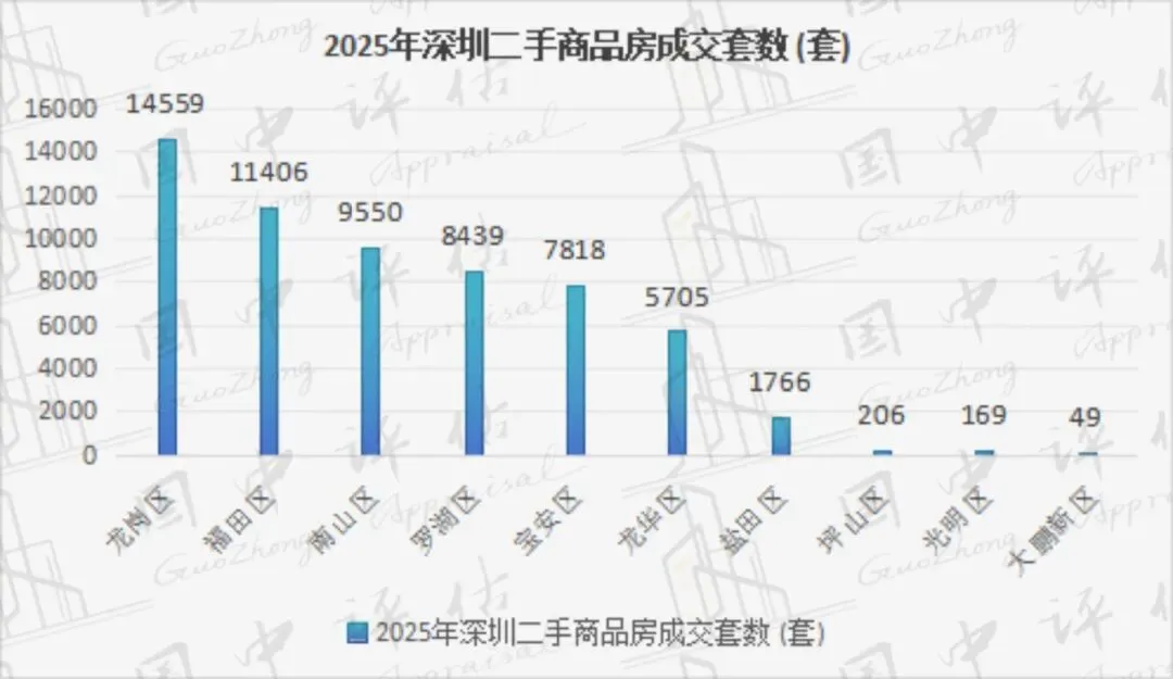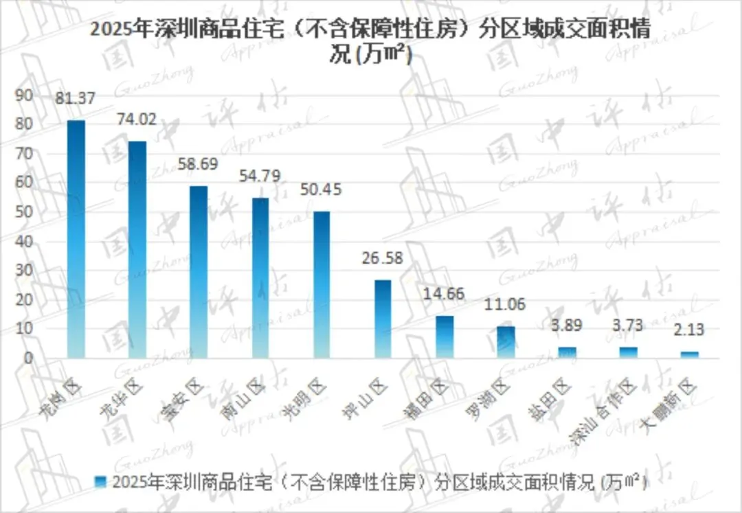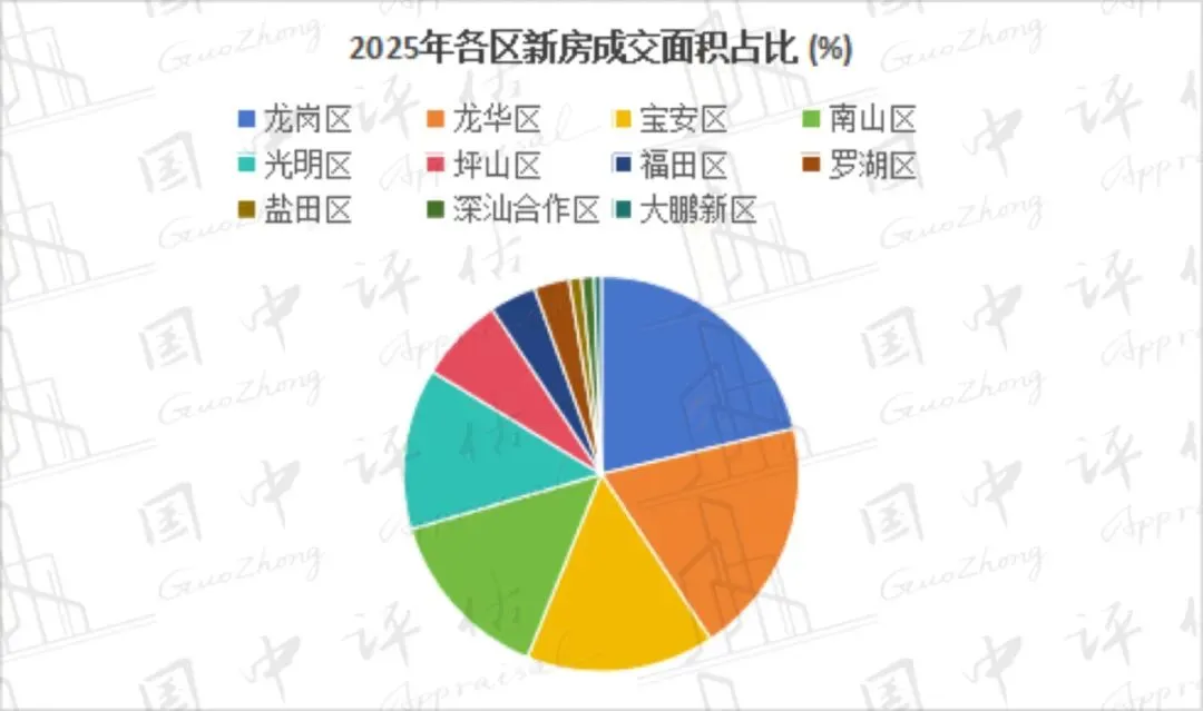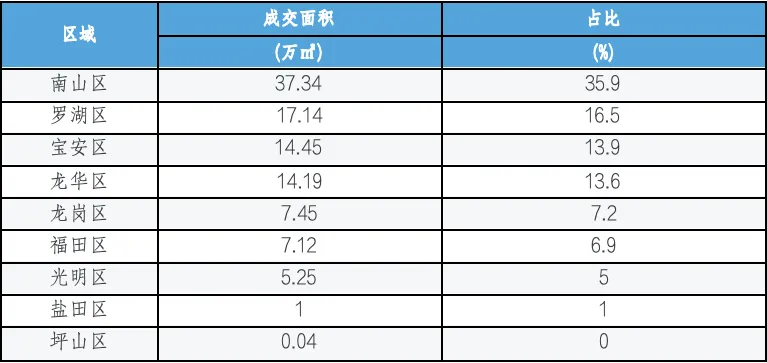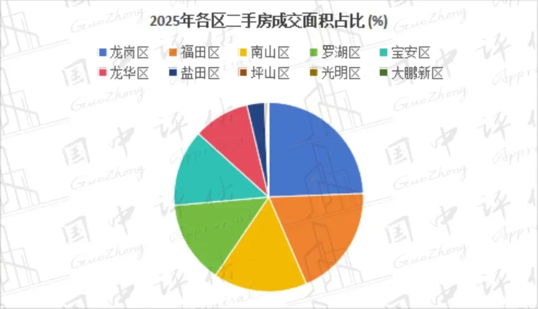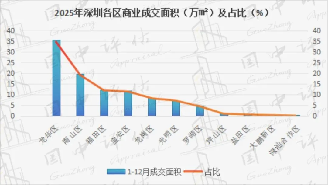 成交面积:2025年,深圳商业成交面积为102.7万㎡,同比增长64.8%;商业成交套数为10376套,同比增长14.7%。其中,龙华区、南山区、福田区等区域为深圳商业成交主力区域,共成交67.97万㎡,占城市成交面积的66.2%。其中,成交面积同比增长的区域有龙华区、大鹏新区、光明区等,同比分别增长451.3%、289.5%、103.0%;成交面积同比下降的区域有深汕合作区、盐田区、龙岗区等,同比分别下降97.0%、54.3%、51.9%。