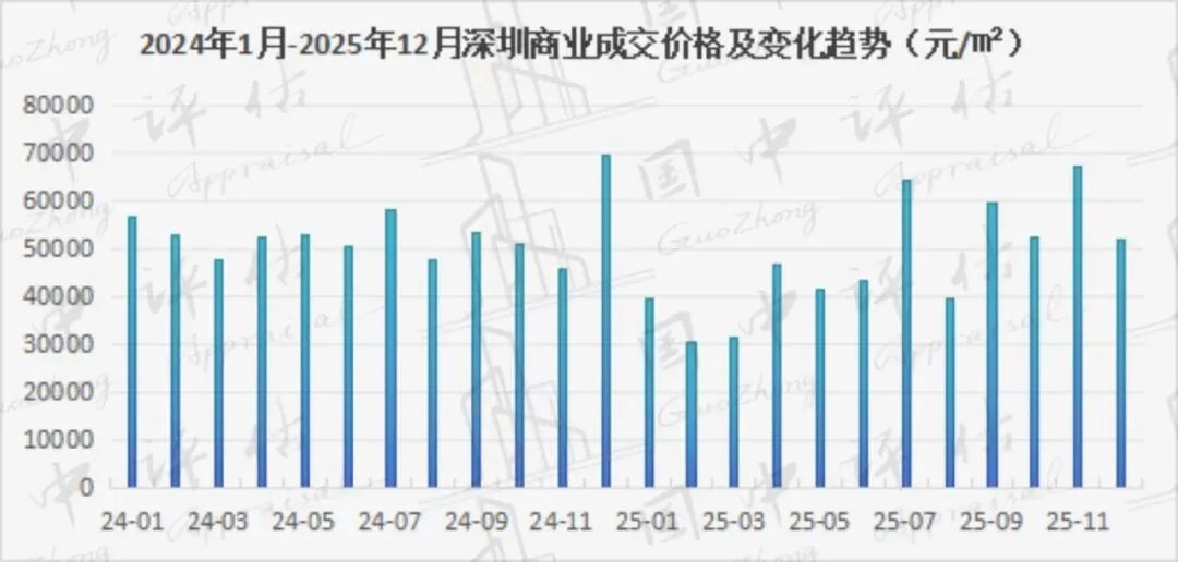 成交价格:2025年1-12月,深圳商业成交均价为43278元/㎡,同比下跌23.6%。