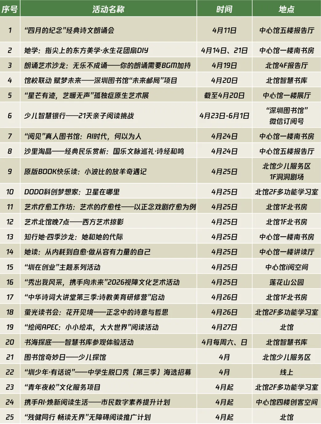 * 更多活动详情请关注深圳图书馆微信公众号活动日历或每日资讯