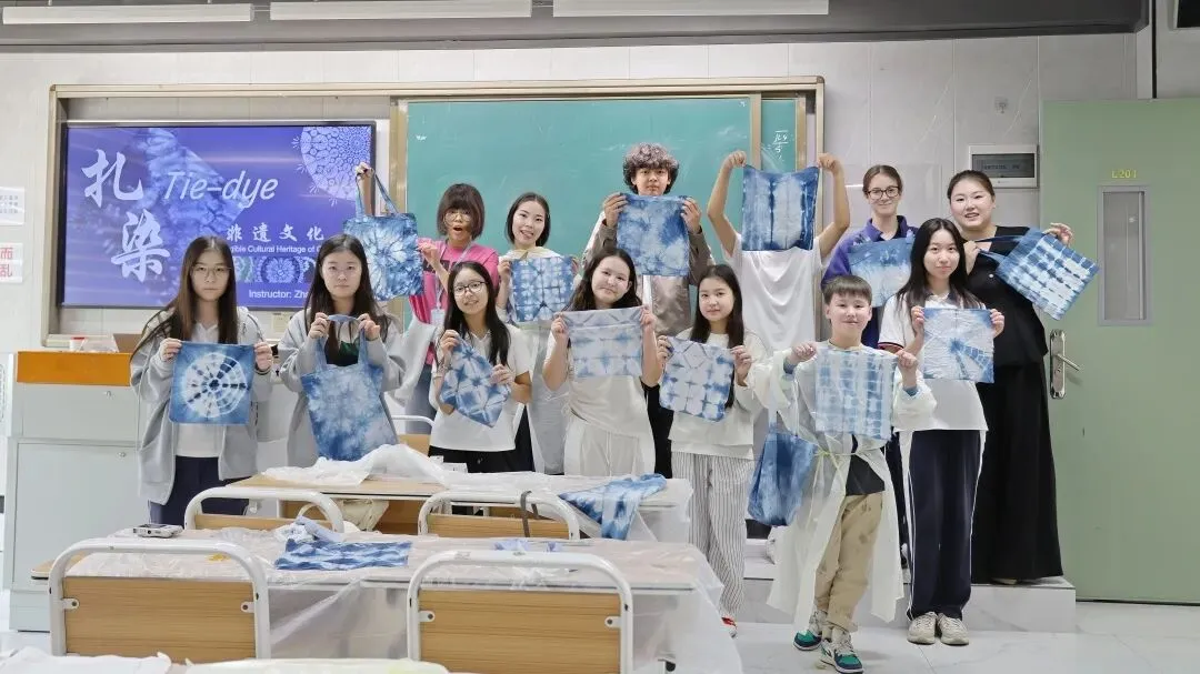 文化课上,非遗扎染的蓝靛在布料上晕开,哈萨克斯坦的同学们第一次亲手触摸中国传统手工艺的温度。从捆扎到浸染,每一块布料都独一无二——就像这段旅程,不可复制。
