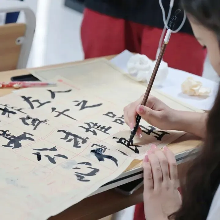 语言课上,毕业班的学姐当起小老师,热爱中国传统文化的外教Kyle也在一旁热情协助。从拼音到书法,他们一字一句地描绘出对这个国家的理解;