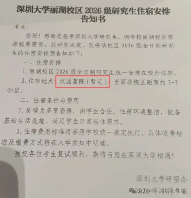 近日,深圳大学拟租赁校外商品房作为研究生宿舍一事引发热议。据《南方都市报》报道,深大丽湖校区计划将2026级全日制研究生统一安排至汉园茗院小区住宿,该小区套均总价超800万元,被网友称为“豪宅宿舍”。然而,深大拟租用的实为本地村股份公司持有的整栋回迁房,并非开发商待售商品房。按该校每学年最高1500元住宿费计算,若一间四房住12人,年租金约18000元,远低于市场价,学生亦难言“豪宅享受”。