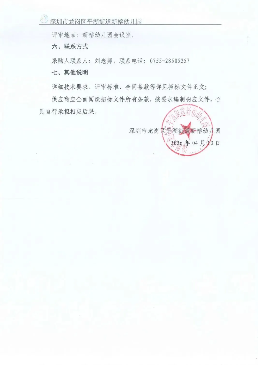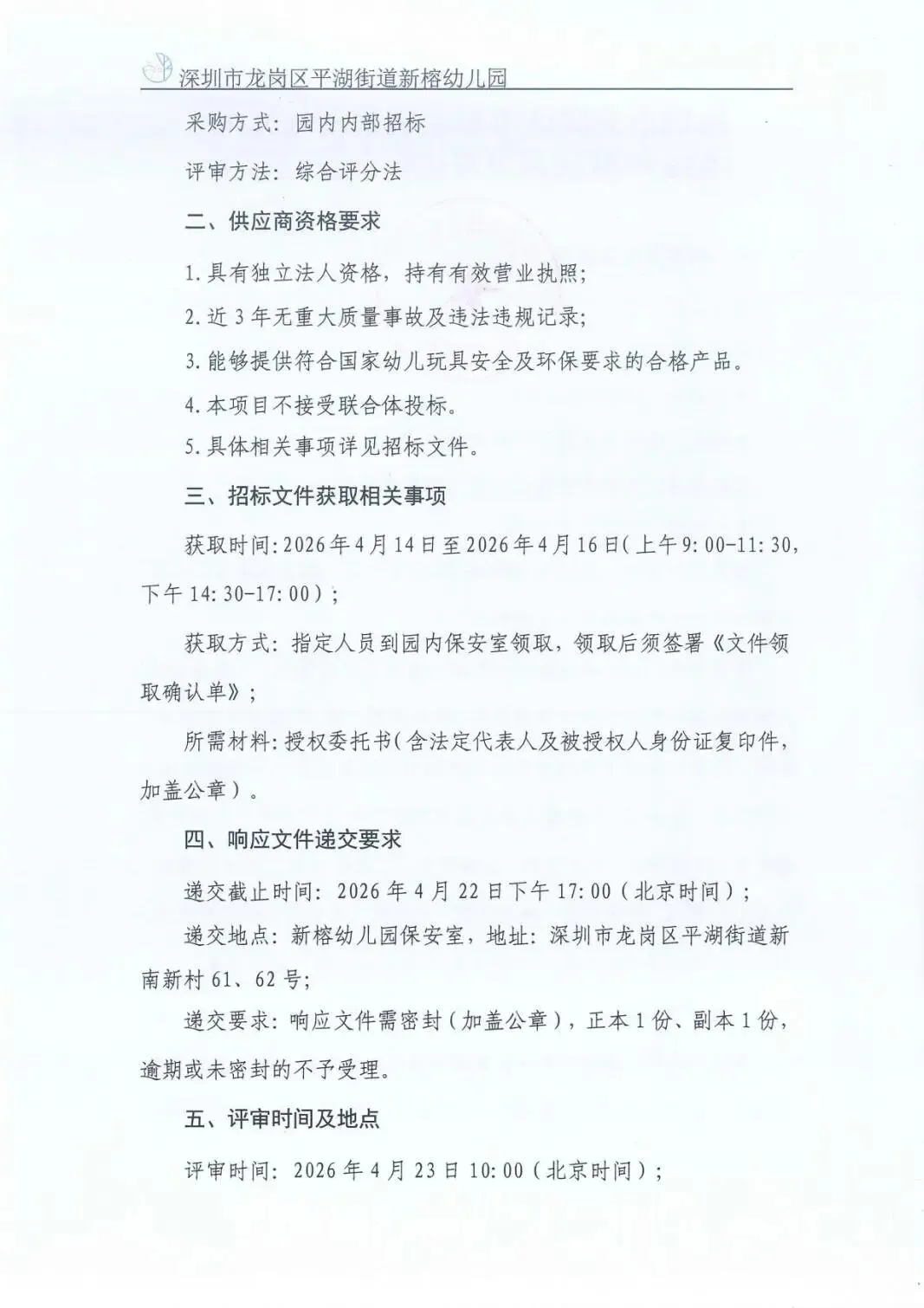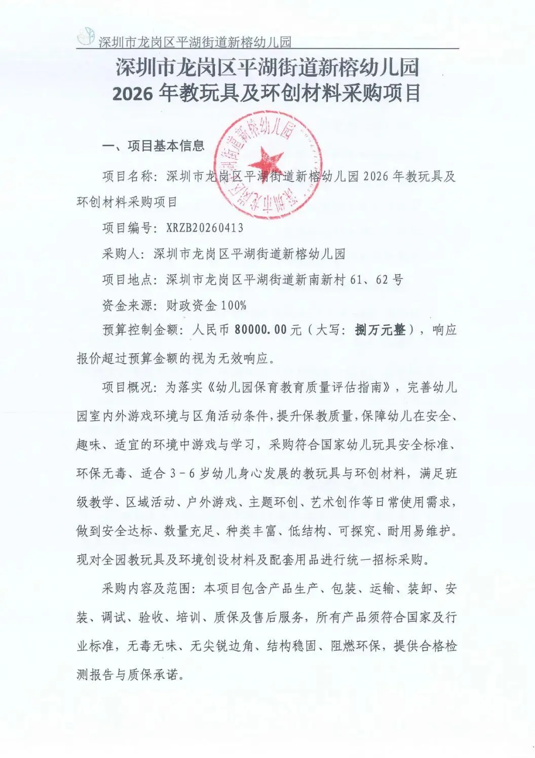 深圳市龙岗区平湖街道新榕幼儿园2026年教玩具及环创材料采购项目