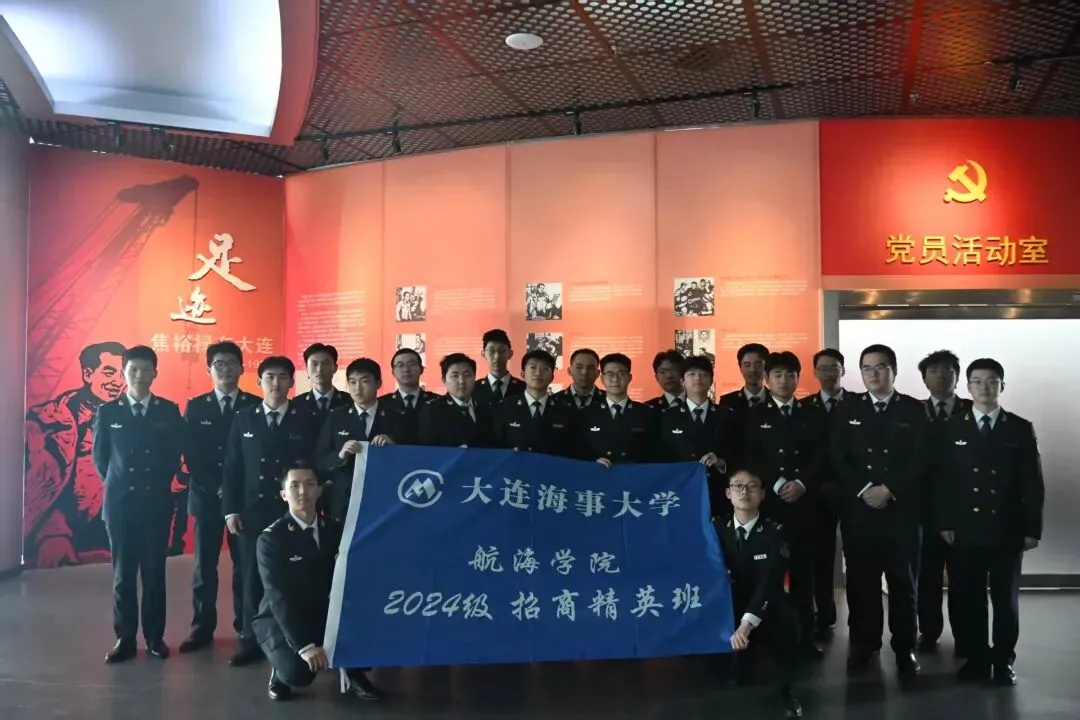 参观结束后,同学们在 “近代大连” 展区与党员活动室前合影留念。统一的制服、整齐的队列、昂扬的精神,彰显着大连海事大学航海学子的青春风貌与责任担当。这张合影,不仅记录了本次实践学习的珍贵瞬间,更定格了 2024 级招商精英班全体同学 “强国有我、航海有我” 的青春誓言。