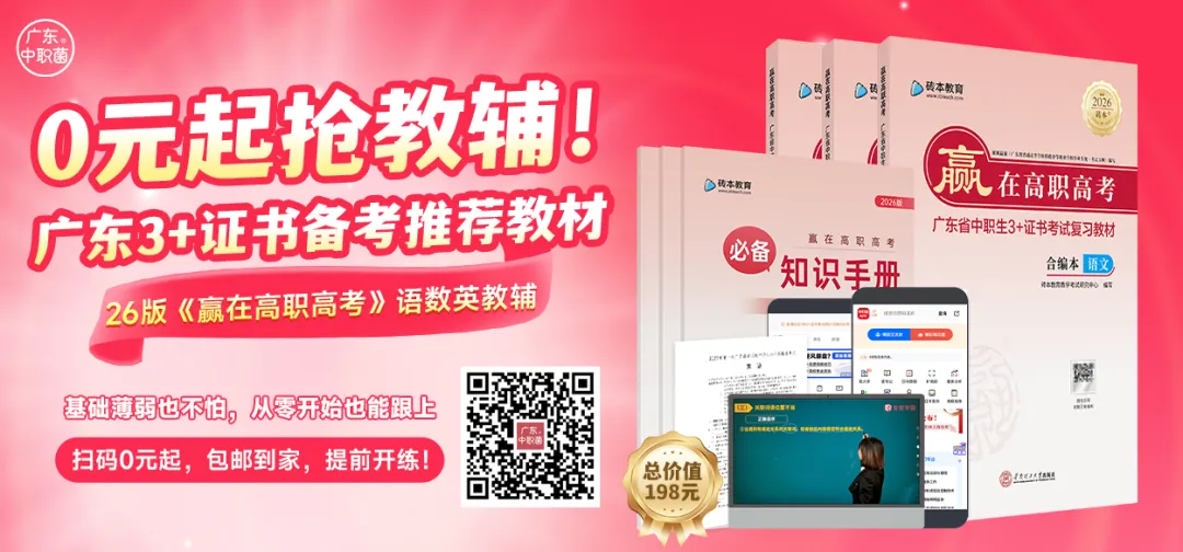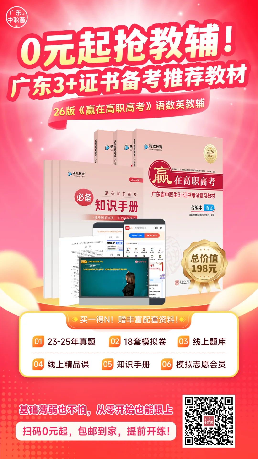海量资料/升学资讯关注【广东中职菌】,回复以下关键字▲回复【进群】加入学习打卡群▲回复【教材】购3+证书备考教辅▲回复【题库】进入3+证书在线题库▲回复【真题】领3+证书历年真题▲回复【证书】领各科技能证书历年真题▲回复【英语】领英语等级证书考试资料包▲回复【计算机一级】领计算机考试资料包▲回复【免费领取】领中职菌资料大礼包▲回复【志愿】查看3+证书招生院校/专业/证书要求/历年录取分等