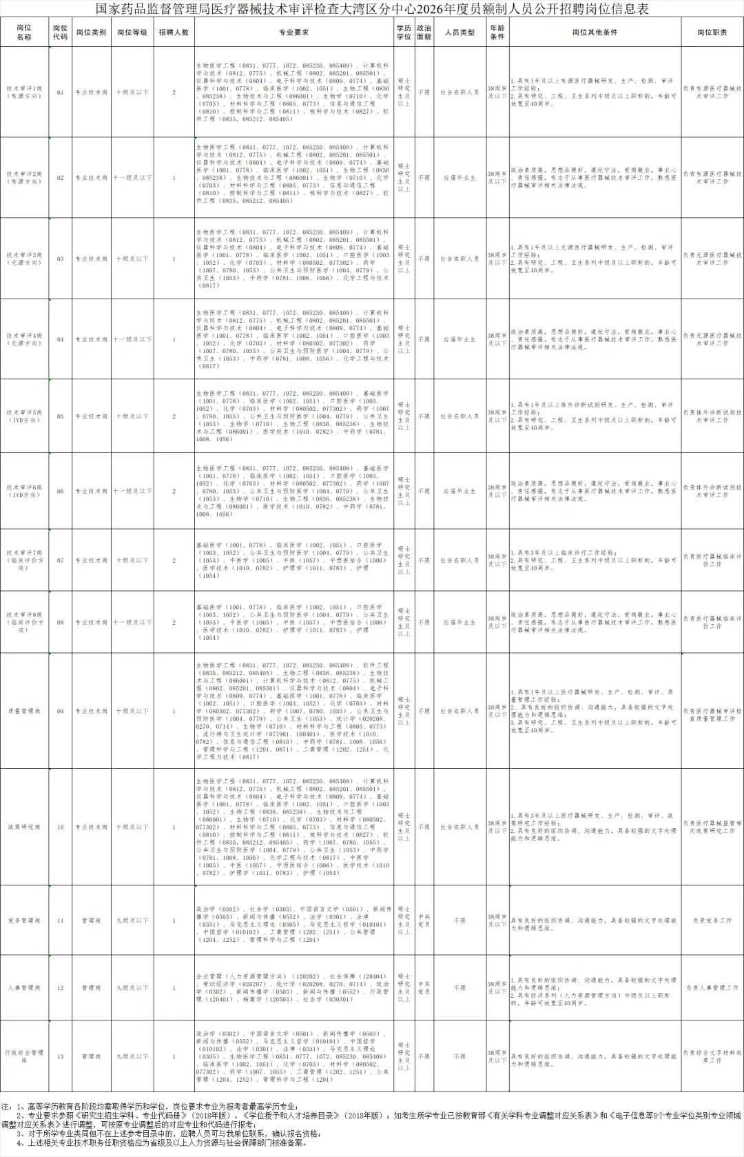 附件:国家药品监督管理局医疗器械技术审评检查大湾区分中心2026年度招聘岗位表