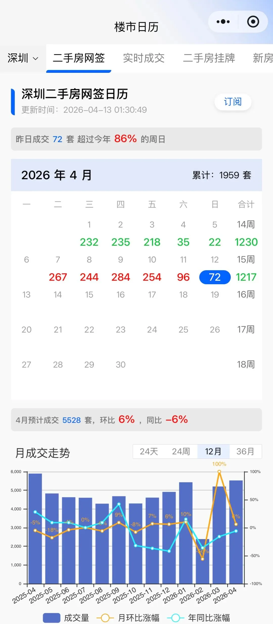 最新的深圳二手房网签数据显示,市场热度正在延续。4月12日(周日)网签72套,这一数据超过了今年86%的周日,反映出周末看房及成交的转化率处于高位。