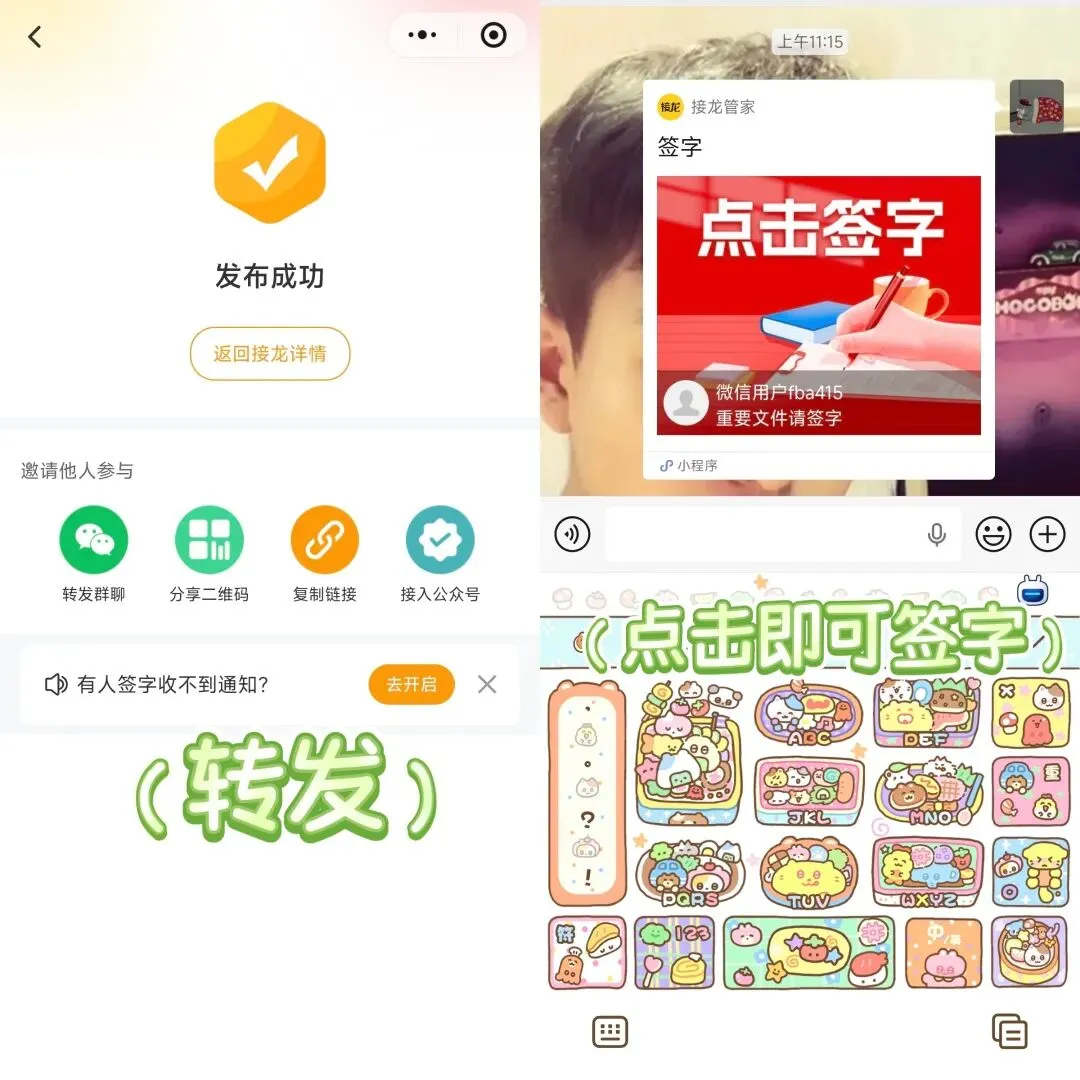 分享到居民群:生成签字链接后,直接转发到业主群或居民群;居民在线签字:居民点链接,在指定位置签好字提交,全程不到 30 秒,不用打印也不用跑腿;