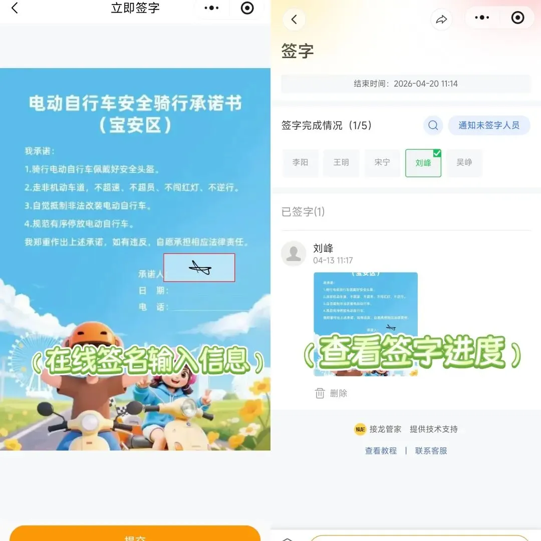 发《电动自行车登记上牌须知》,收集居民签字确认,配合全市的规范化管理。用接龙管家的文件签字功能,这些工作都能在线上高效完成,留痕清楚,汇报也方便。