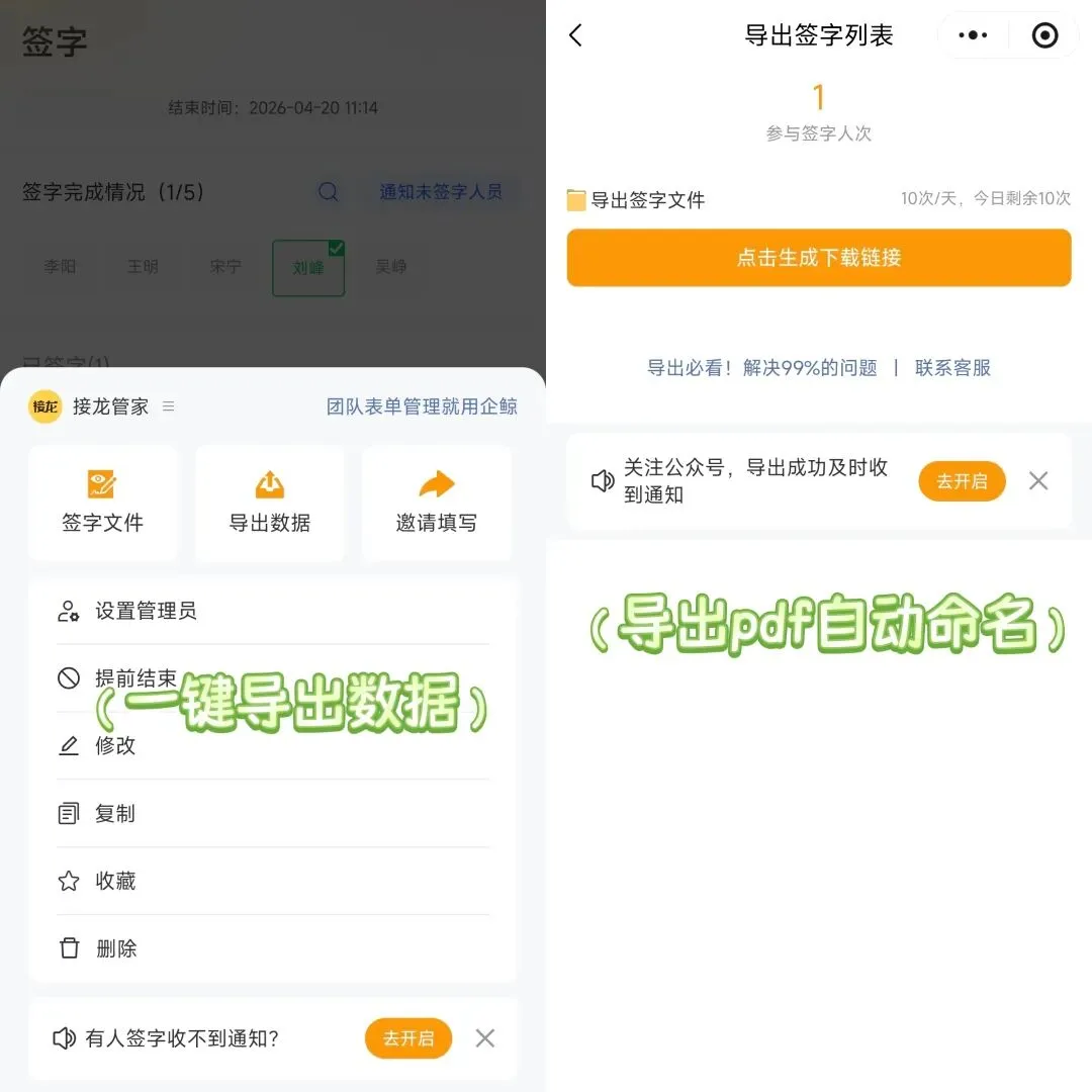 后台自动管理:随时能看谁签了、谁没签 —— 智能名单标进度,绿色是已签,灰色是没签;一键归档留痕:所有签好的文件自动保存,点一下导出打包下载,随时能查。